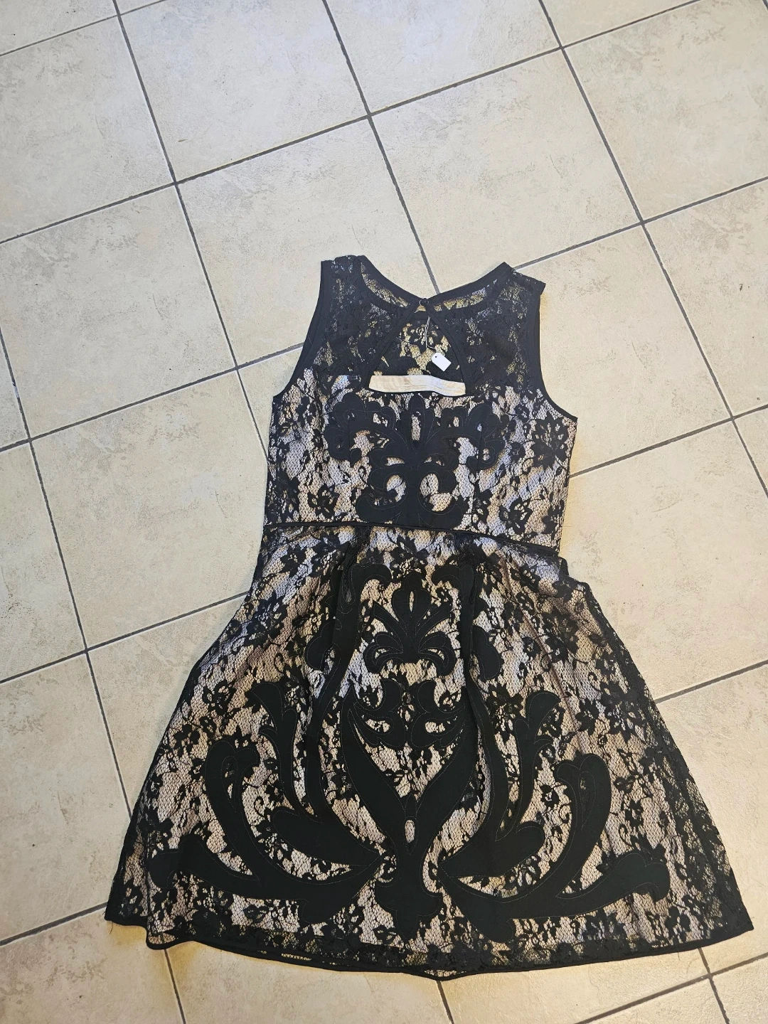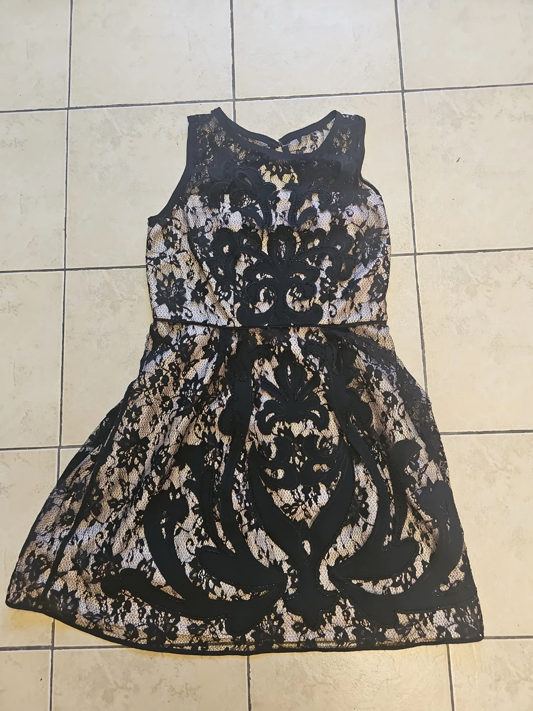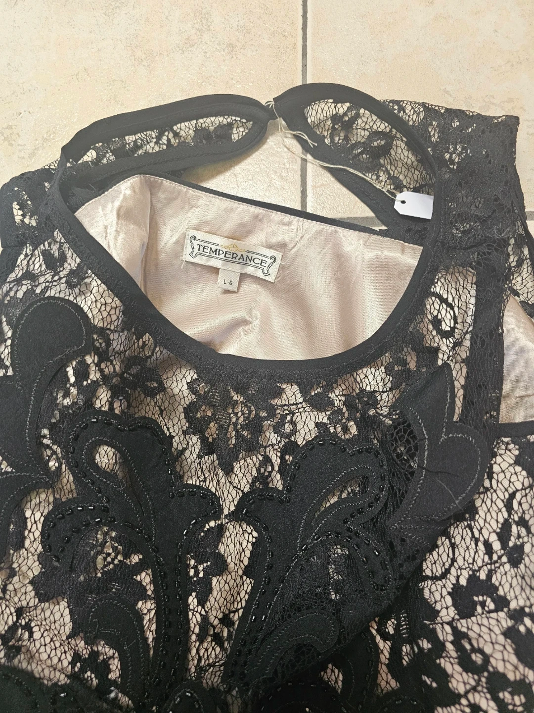 Selling a lovely Temperance dress! It's a size L and features a beautiful black lace design. Perfect for a special occasion or a night out