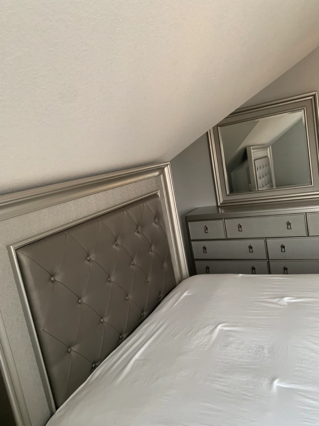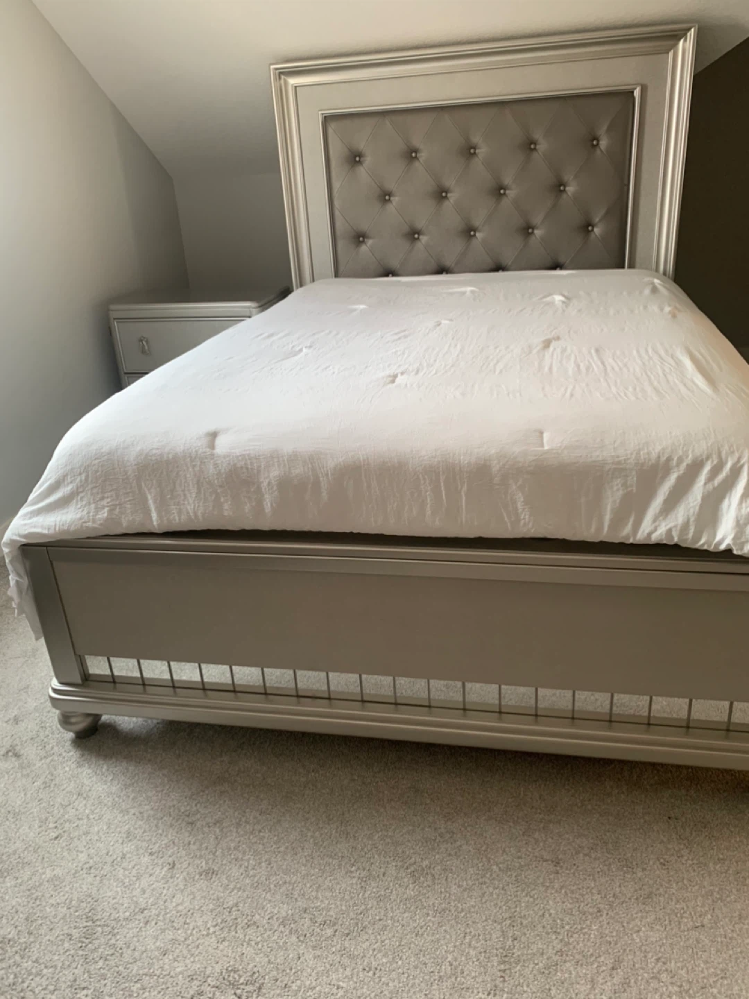 This bed frame features a striking silver finish with a diamond-tufted headboard. It's a Queen size bed. Perfect for adding a touch of elegance to any bedroom. Includes the bed frame and headboard.