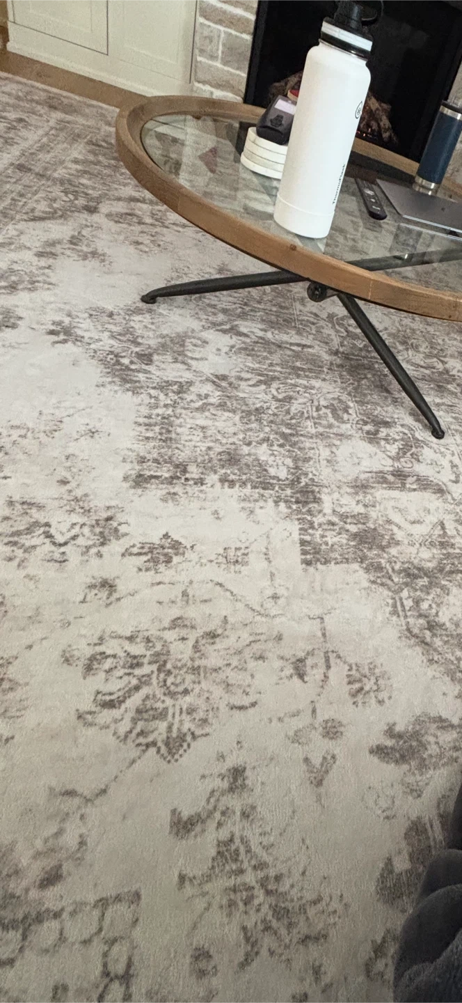This area rug features a distressed pattern with neutral tones. It's soft and would complement many decor styles. Provides a cozy foundation for your living space. - no pet house hold