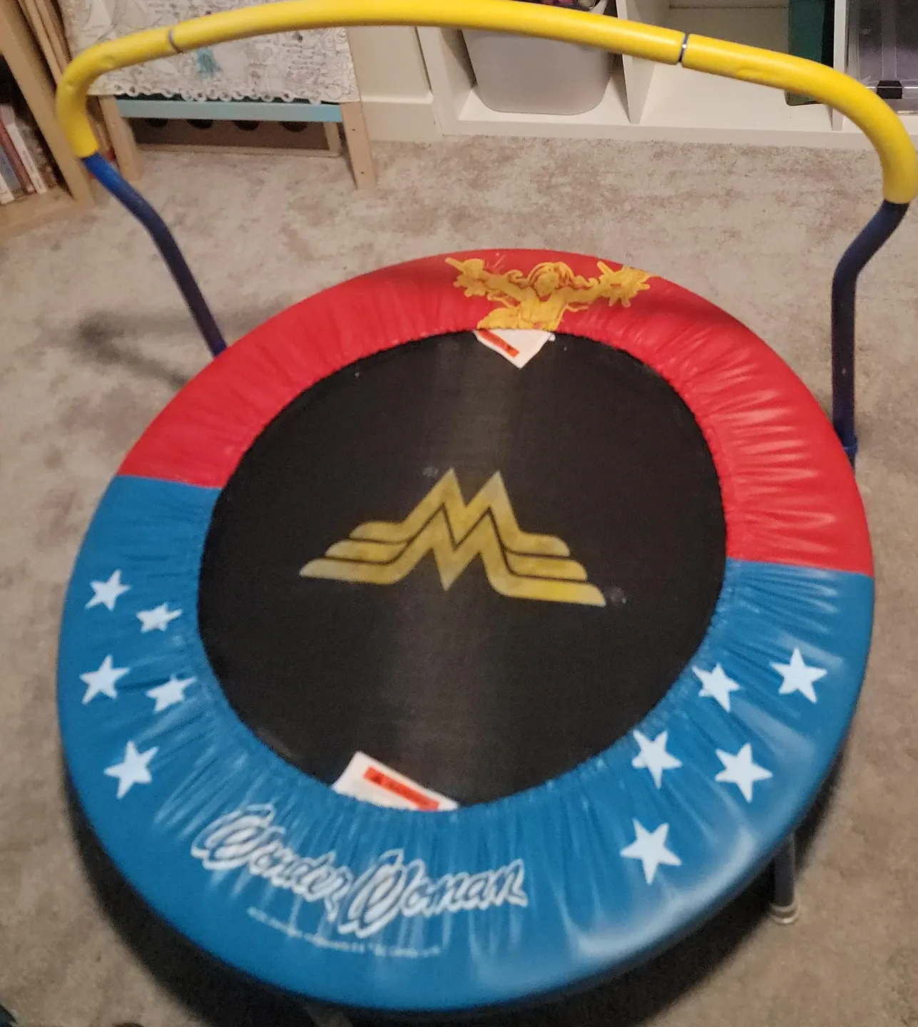 Kids' trampoline featuring Wonder Woman graphics. It has a safety handle for support and a durable jumping surface. Perfect for active play indoors or outdoors!