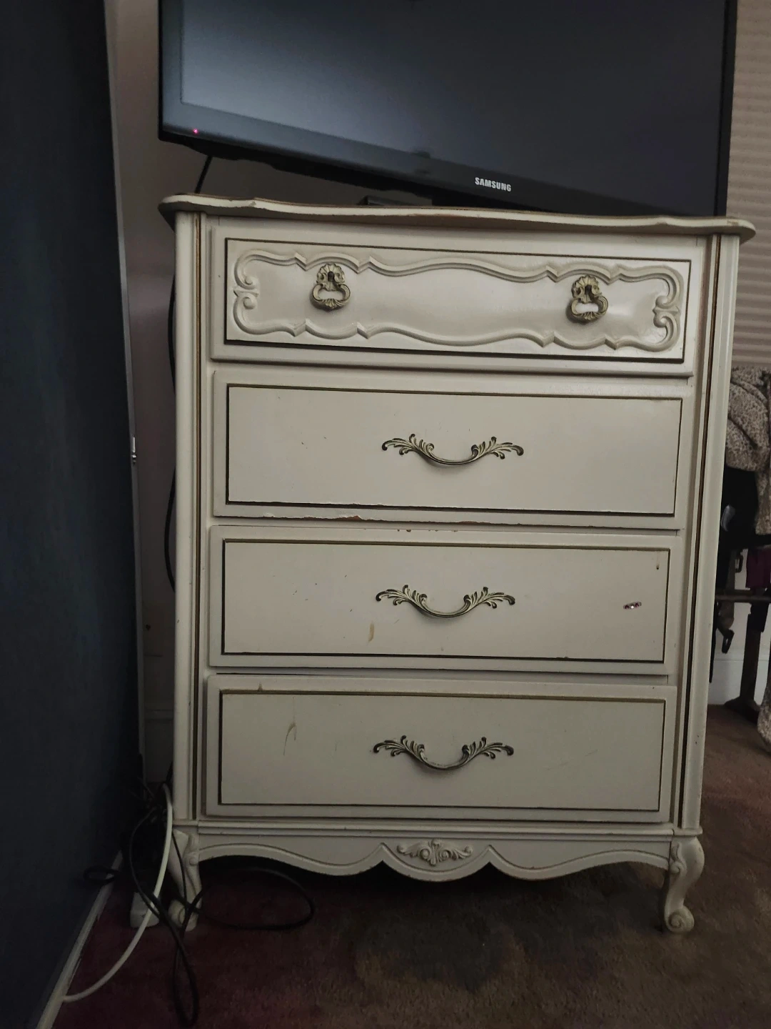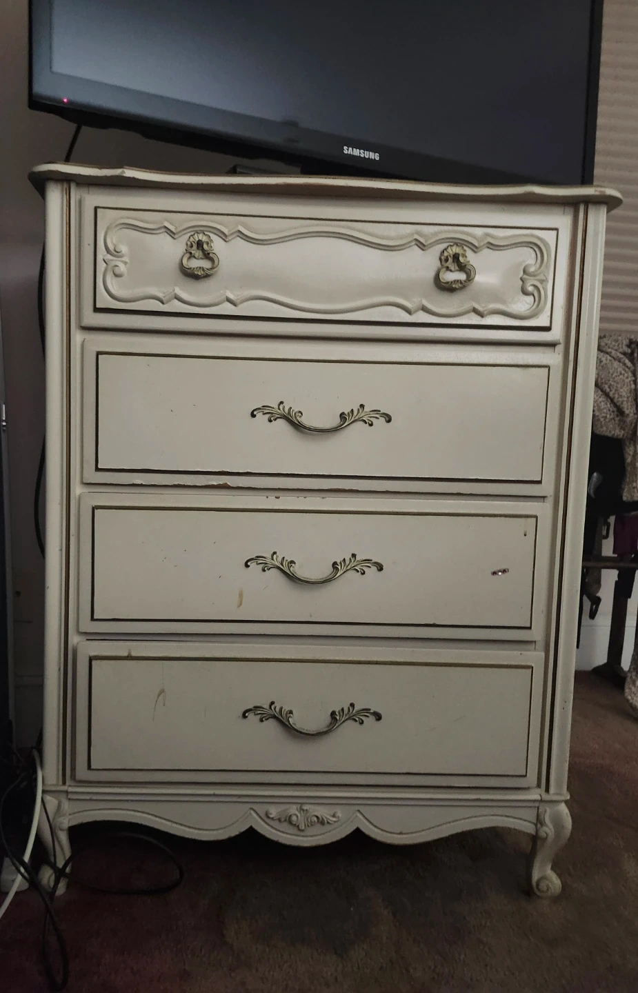 This white dresser features four drawers with ornate gold-toned hardware. Its vintage-inspired design includes decorative trim and cabriole legs. Offers ample storage space for clothing or linens. It's a charming addition to any bedroom!