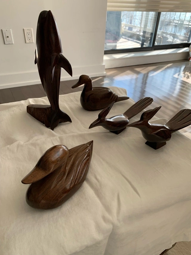 I'm offering a set of ironwood sculptures from the Dominican Republic, dating back to approximately 1980. These used carvings showcase the natural beauty and unique craftsmanship of Dominican artisans from that era. A dolphin, ducks and other birds comprise the set. Perfect for collectors or anyone who appreciates unique decor. Given that these pieces have journeyed through time, they carry subtle signs of their age, which only adds to their story and charm. But don't worry, they are still the works of art they were always meant to be! If the ad is up, yes, they are still available! Cash accepted.