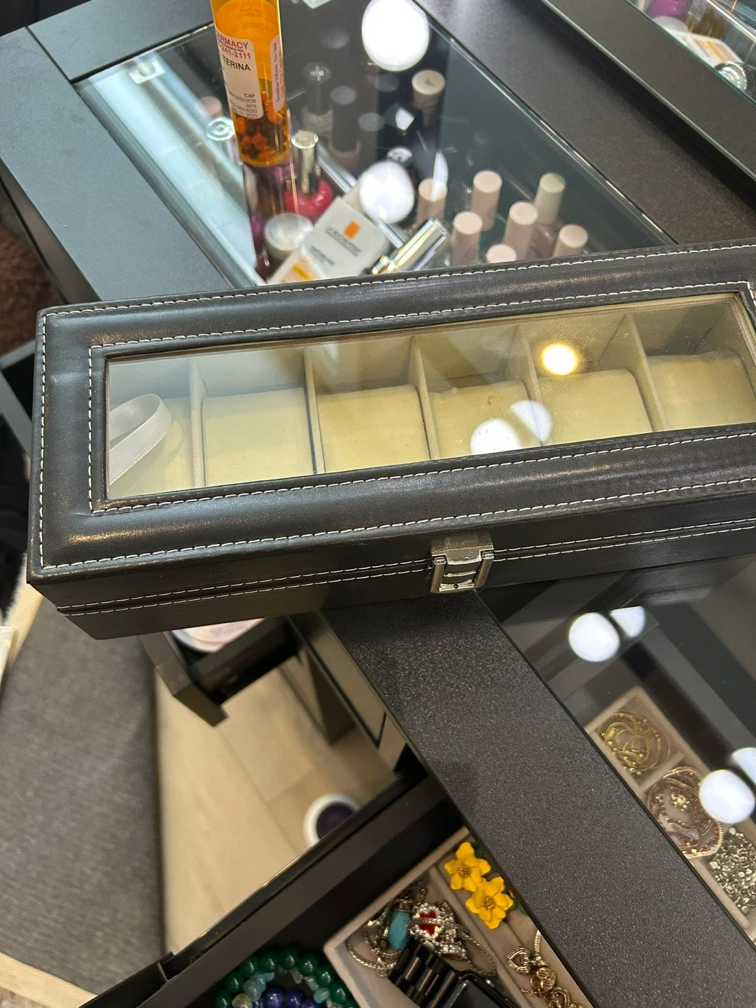 Black faux leather watch display case with a clear glass lid. It has 6 individual compartments with soft cushions to hold watches. The clasp closure keeps everything secure. It's a handy way to store your watch collection!