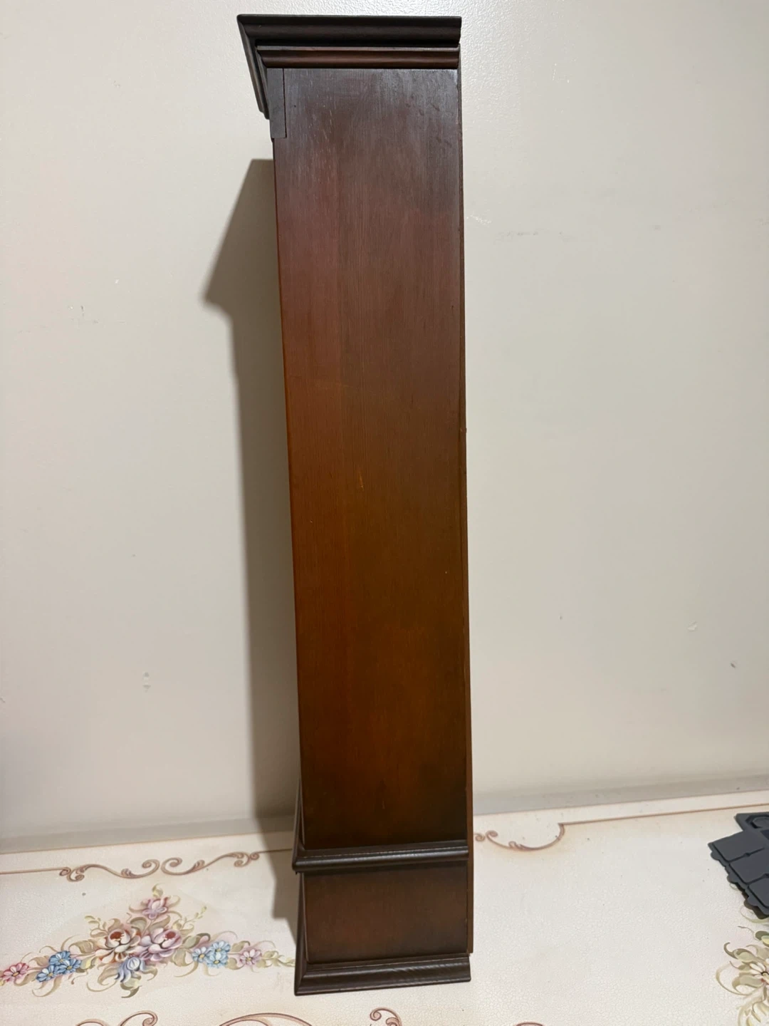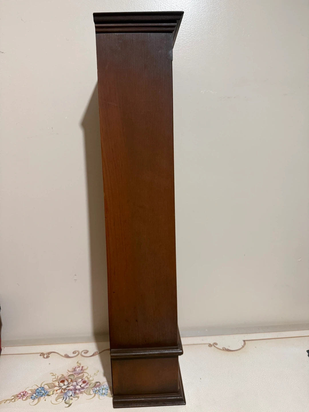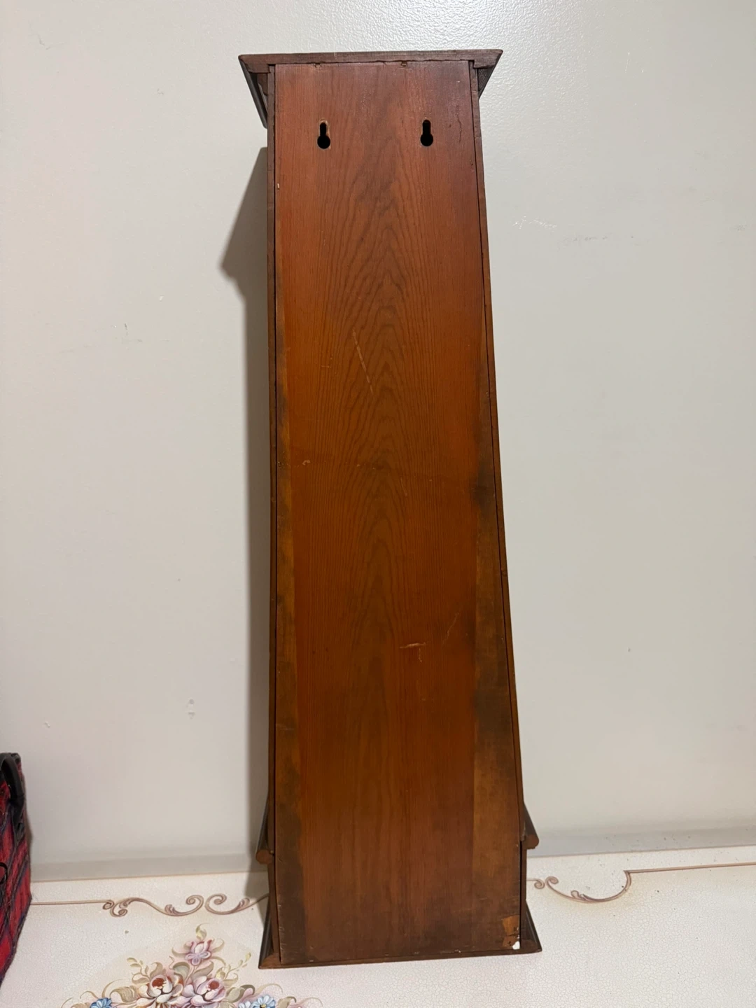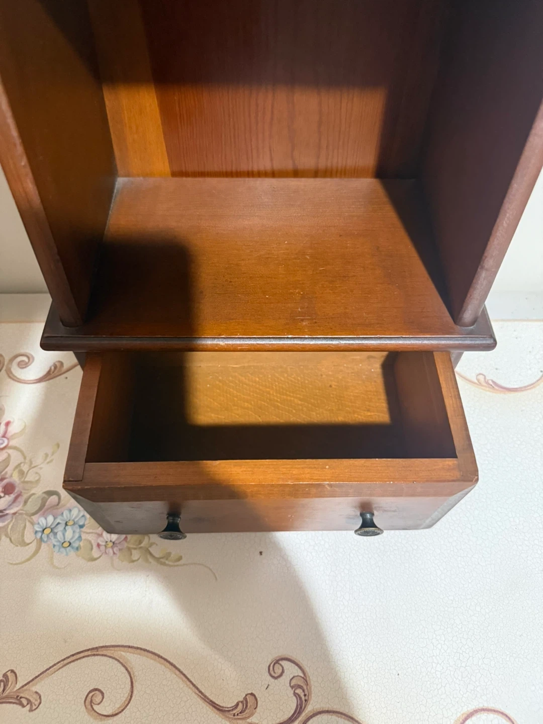 Can be hung on wall or can be displayed on a table. Can hold mini perfume or trinkets for display.Has a drawer.