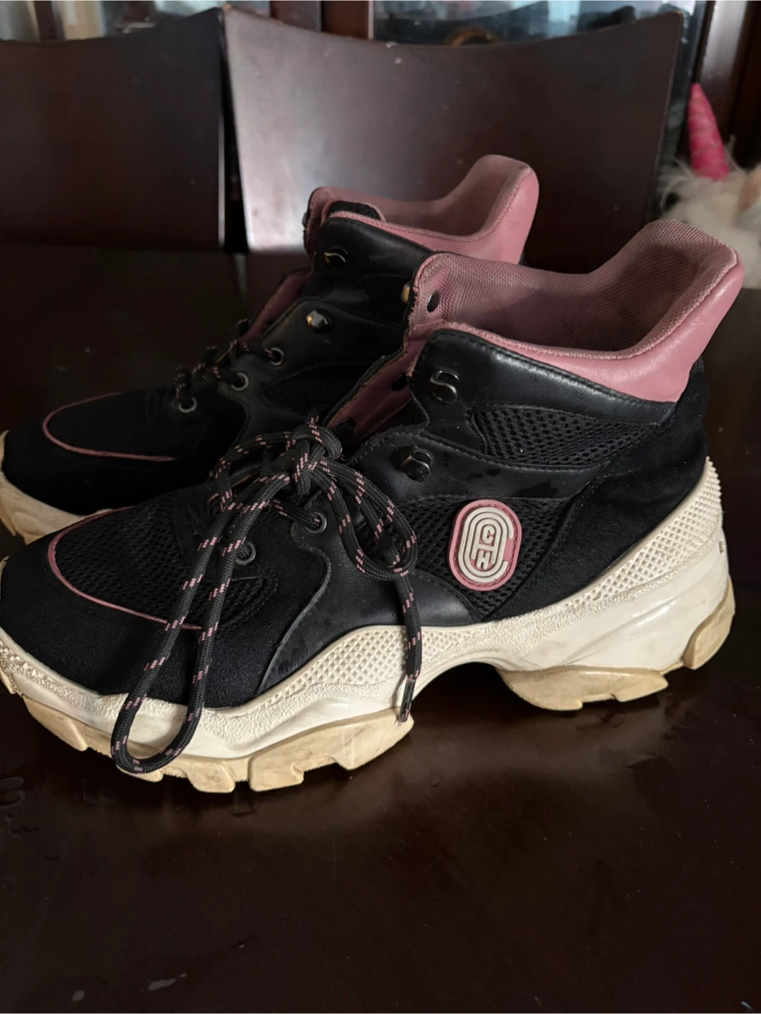 Coach high-top sneakers in black with pink accents. Lace-up closure for a secure fit. These stylish kicks are ready for your next adventure. They're a great addition to any casual outfit!