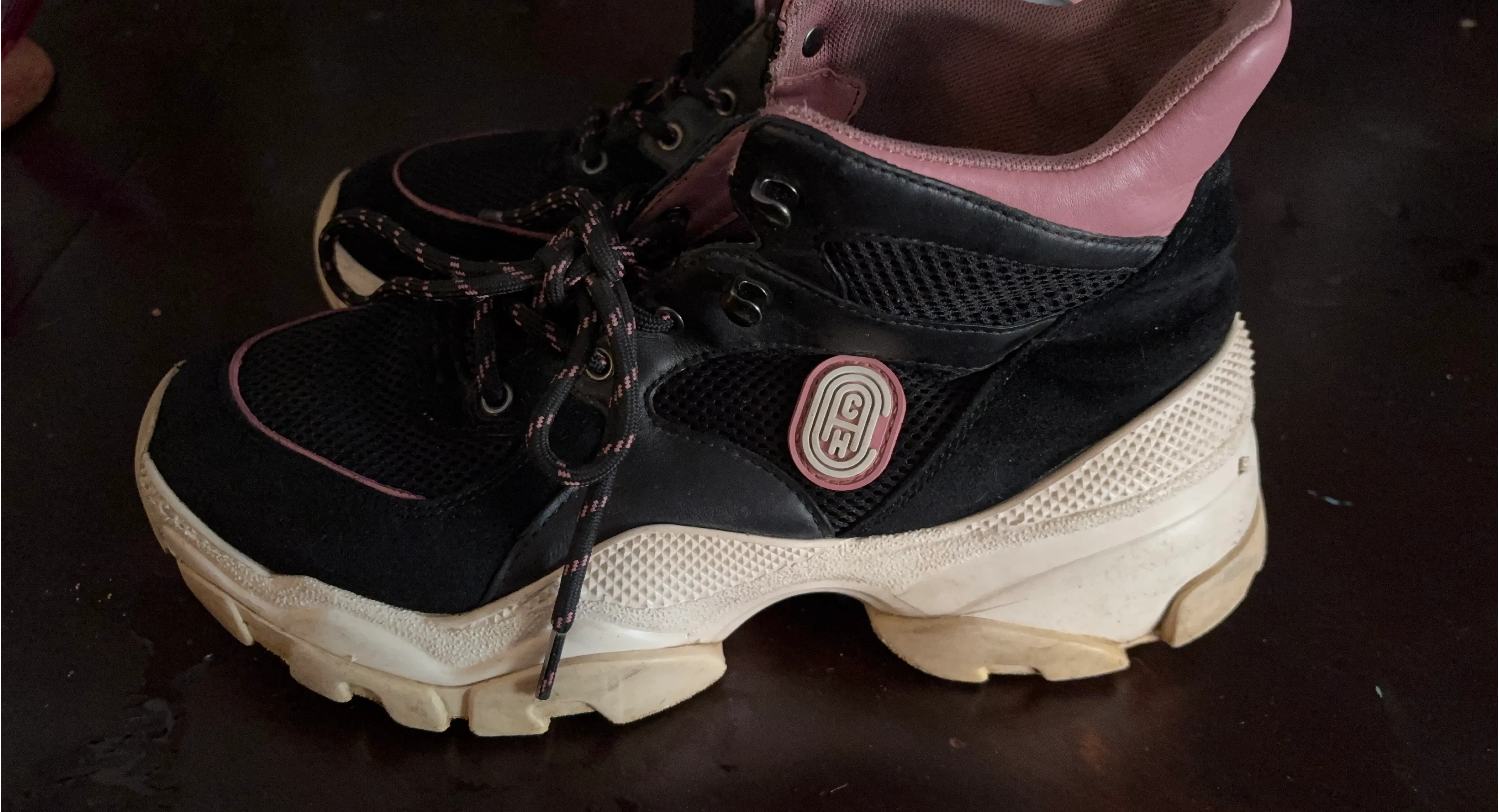 Coach high-top sneakers in black with pink accents. Lace-up closure for a secure fit. These stylish kicks are ready for your next adventure. They're a great addition to any casual outfit!