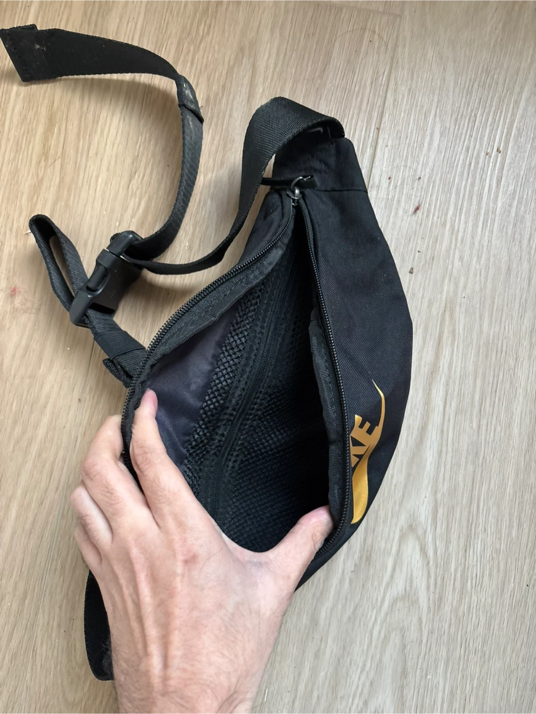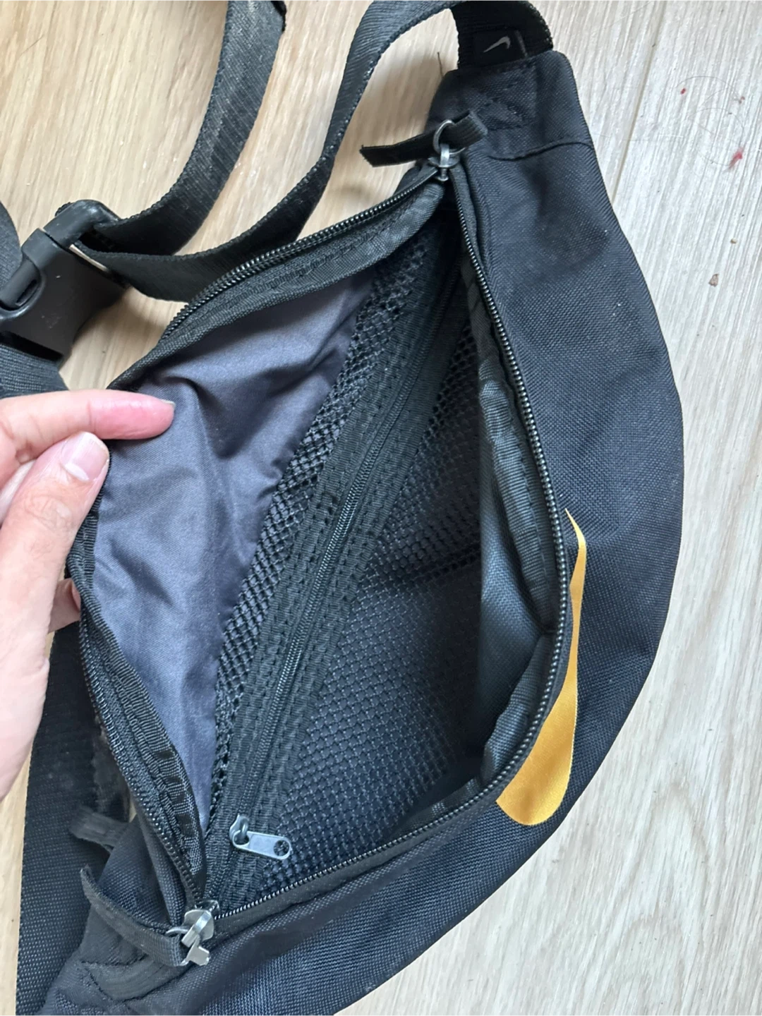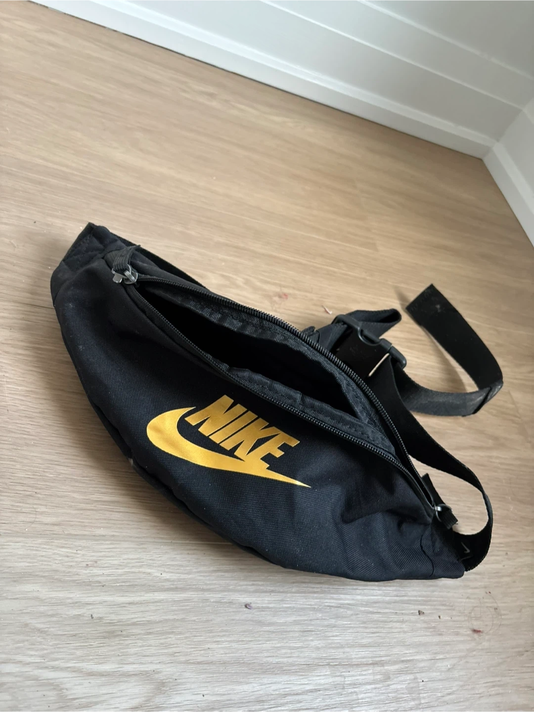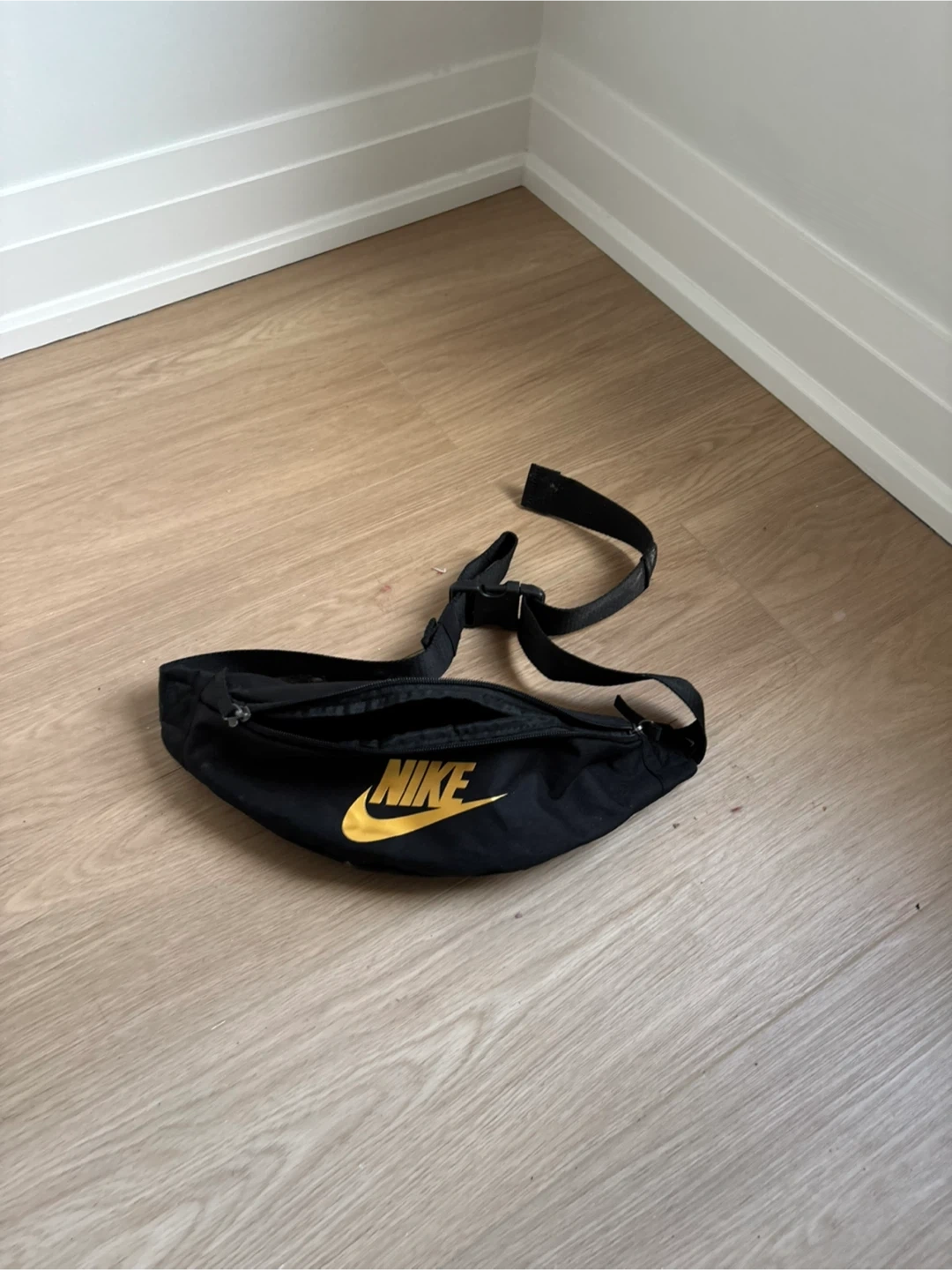 This is a black Nike fanny pack with a bold yellow Nike logo. It's got multiple zippered compartments for your essentials. Durable fabric construction.
