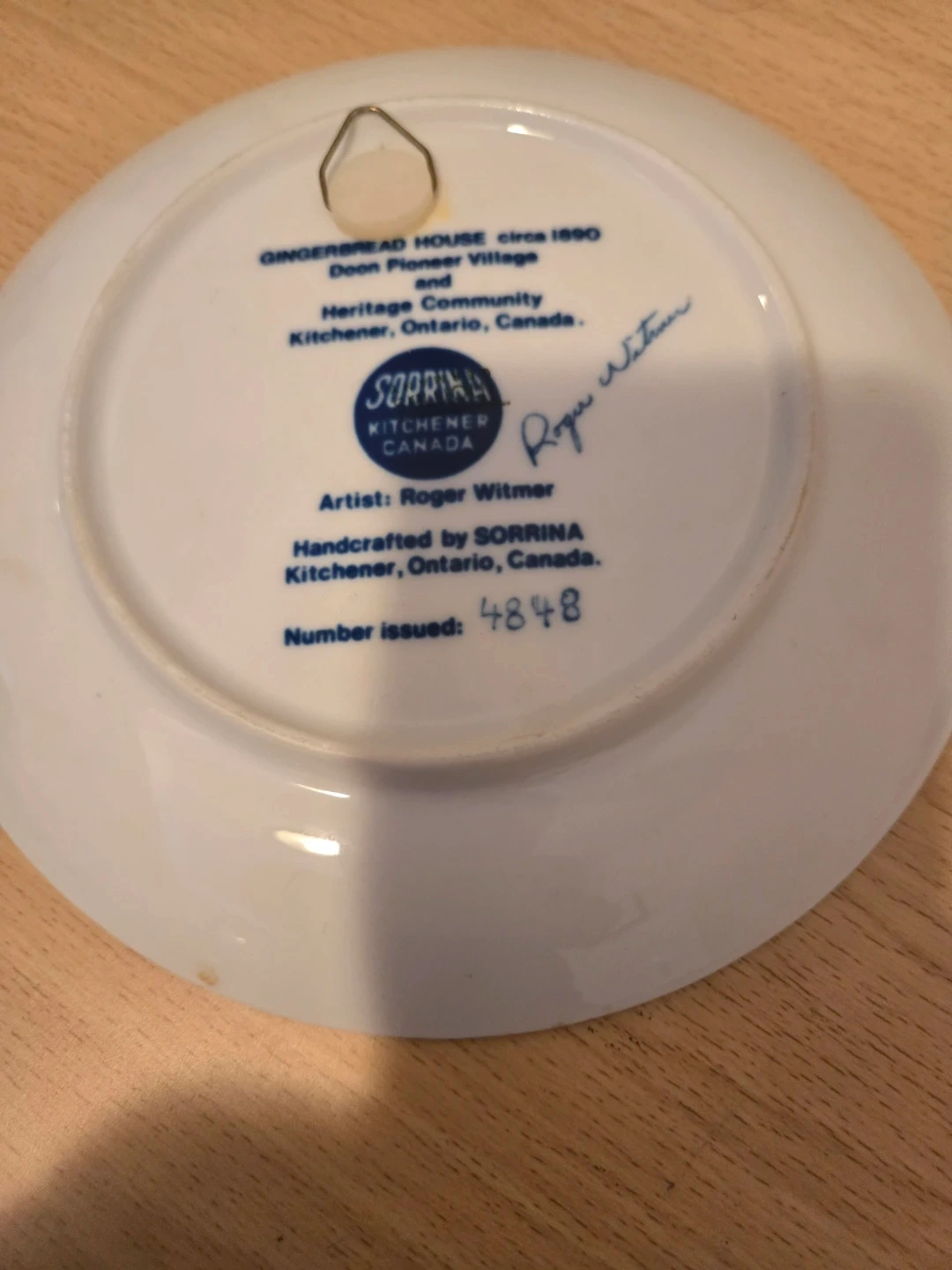 This is a handcrafted collector's plate by Sorrina, featuring a winter scene of a gingerbread house circa 1890. It's part of the Doon Pioneer Village and Heritage Community collection. This specific plate is dated Christmas 1981 and artist Roger Witmer signed it. Number issued: 4848.