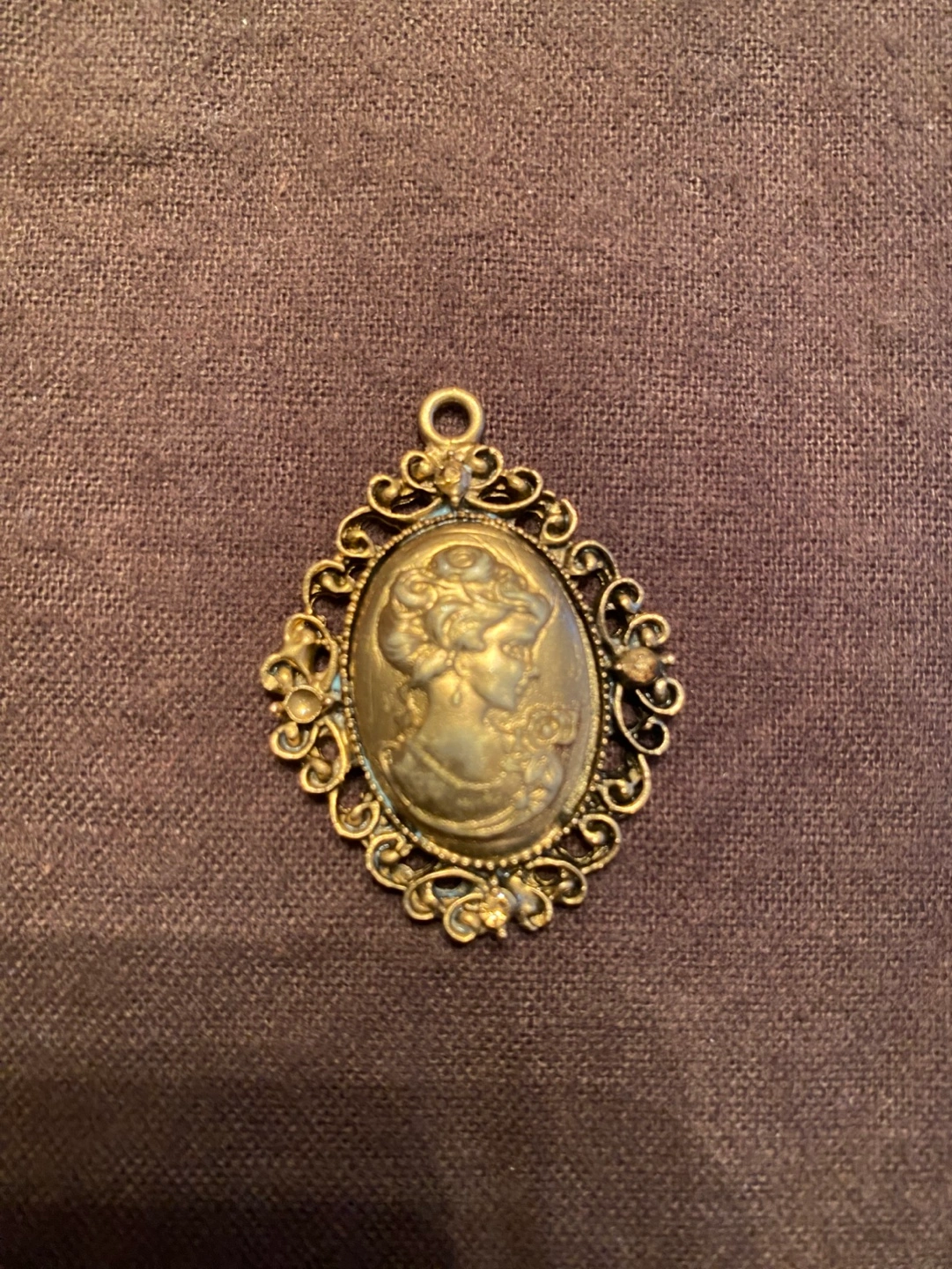 Antique gold-toned metal pendant. Features an oval cameo with a woman's profile. Intricate filigree metal frame. Perfect for adding to a necklace.