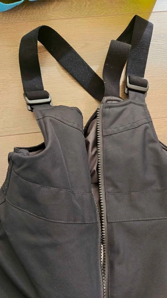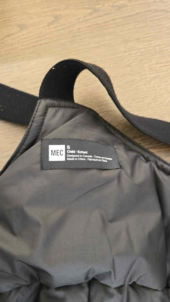 Warm MEC snow bibs for kids. Black color with adjustable straps and a front zipper. Size Child 5. Great for playing in the snow or ski trips.