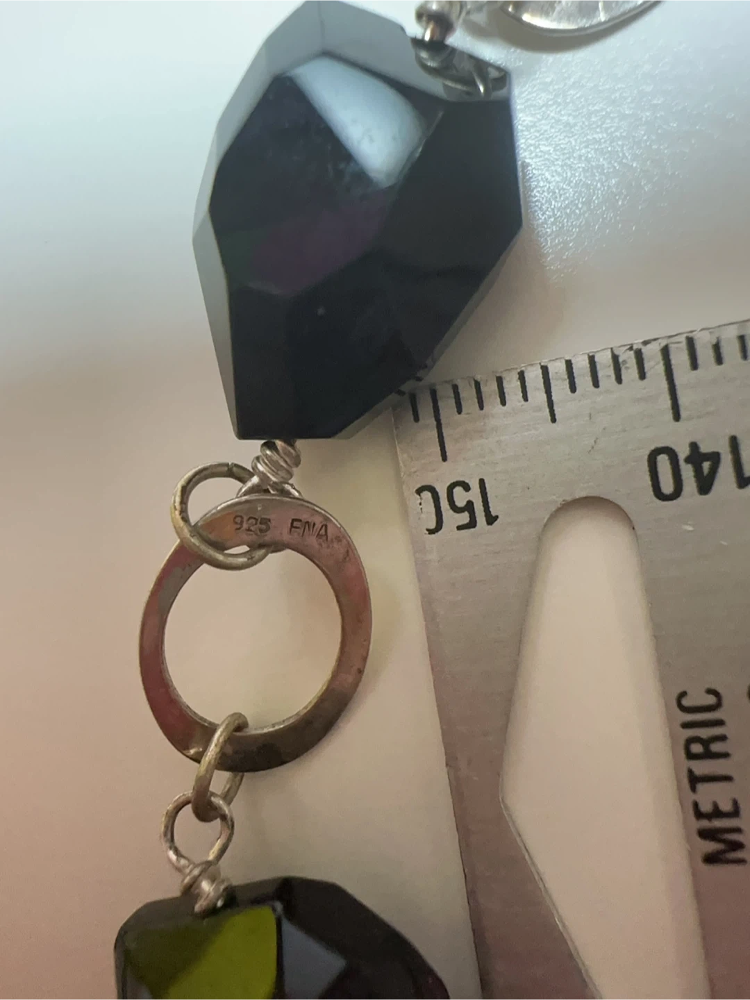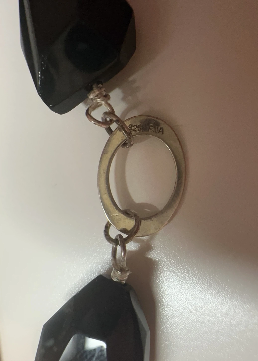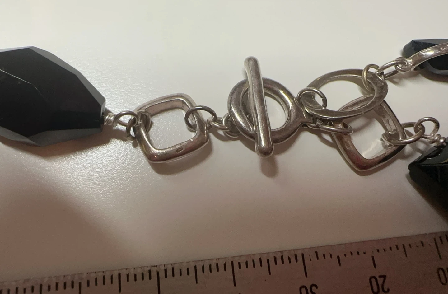 Here's a striking necklace featuring black crystal stones and sterling silver links. The necklace has a toggle closure, and the silver is marked '925' all over the necklace. It's a beautiful piece that will add a touch of elegance to any outfit