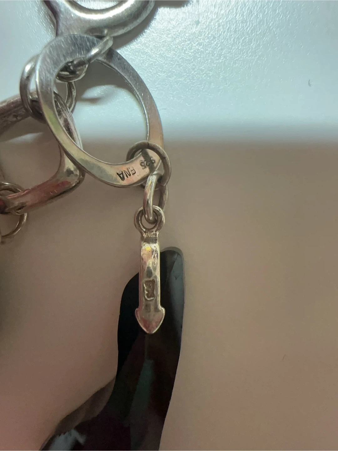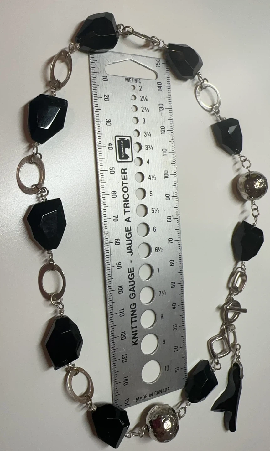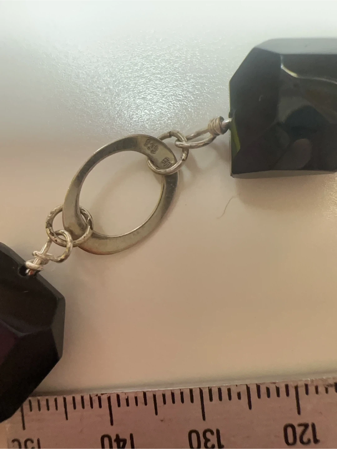 Here's a striking necklace featuring black crystal stones and sterling silver links. The necklace has a toggle closure, and the silver is marked '925' all over the necklace. It's a beautiful piece that will add a touch of elegance to any outfit