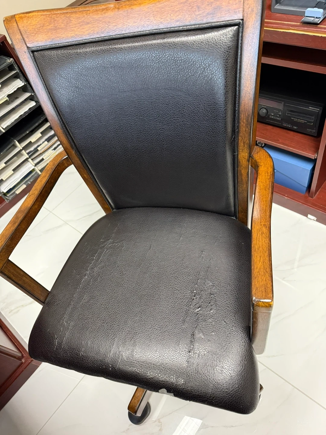 Selling a wooden office chair with black leather. It shows some signs of wear on the seat, but it still has a lot of life left in it. It's a sturdy and comfortable chair, perfect for a home office or study