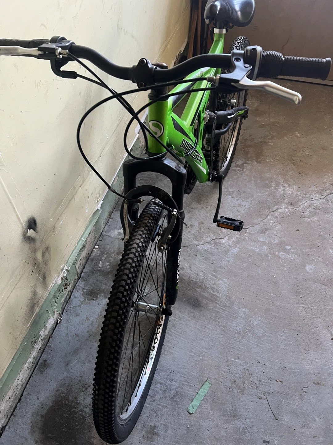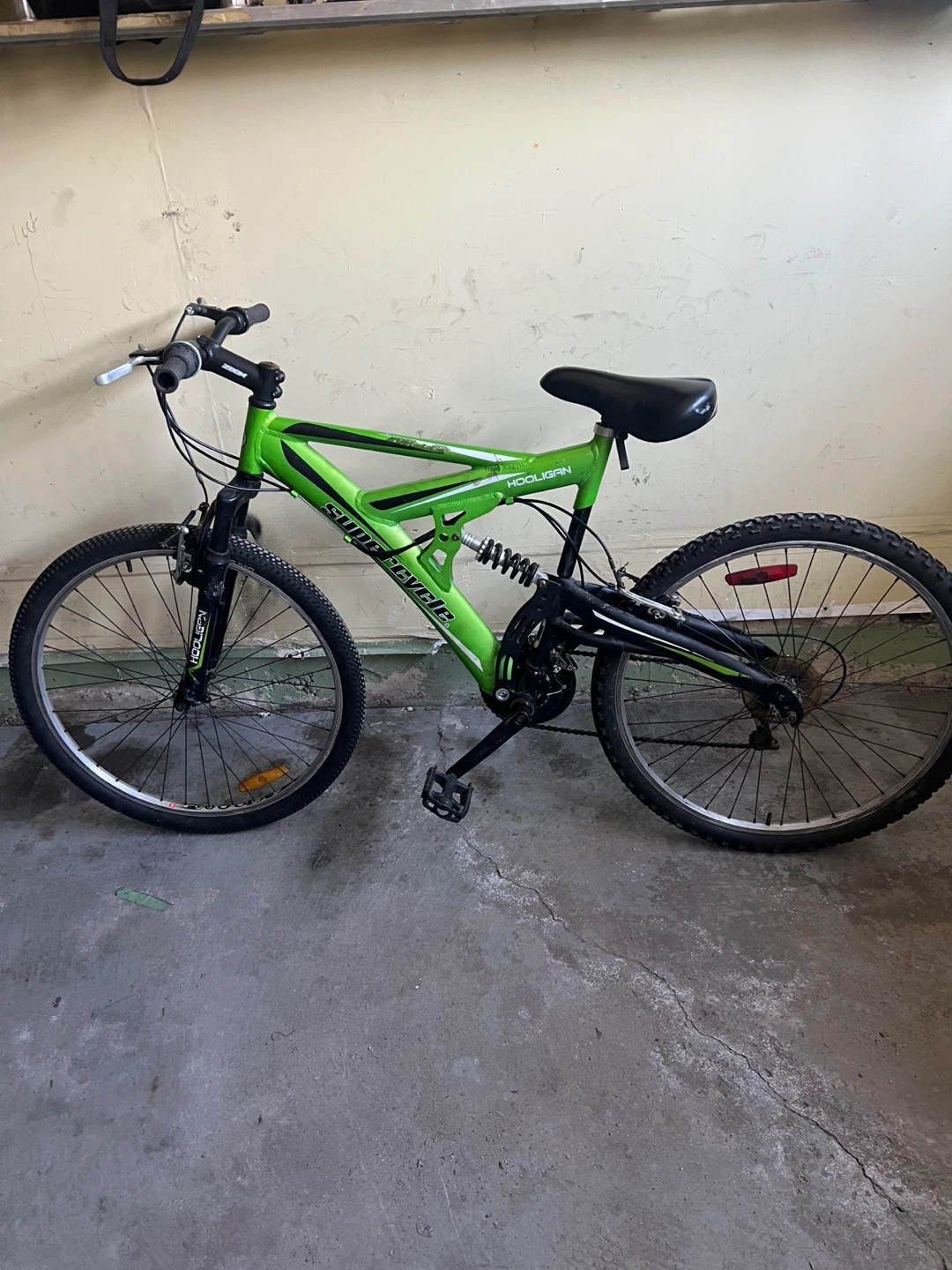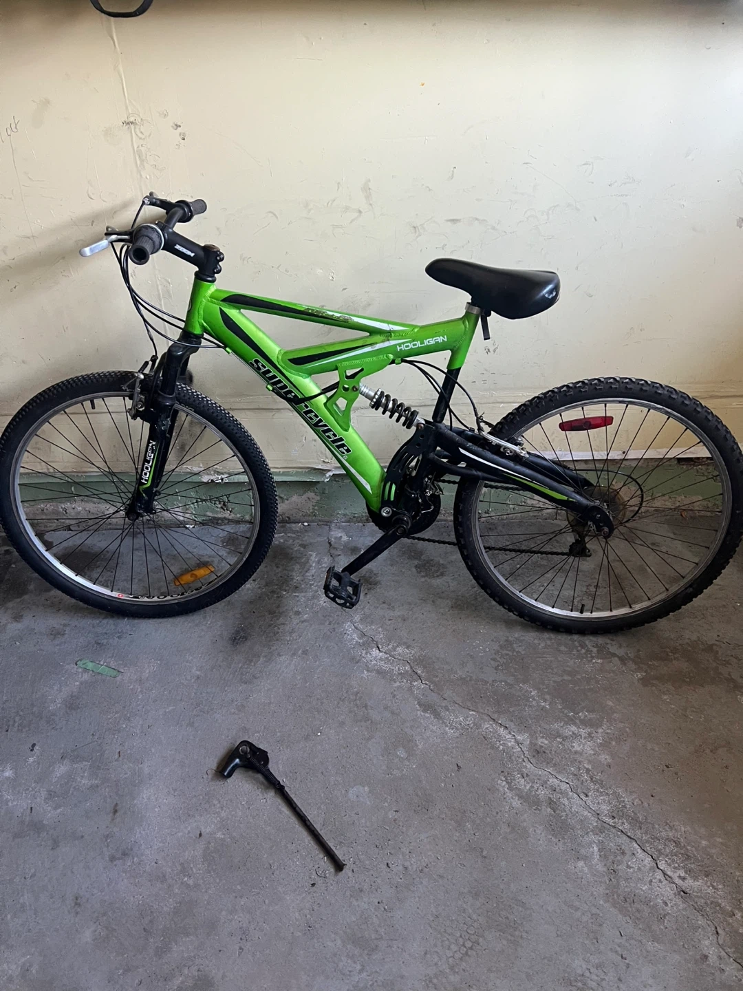 This is a green Supercycle Hooligan mountain bike. It has front and rear suspension for a smoother ride. Perfect for trail rides or casual cycling.