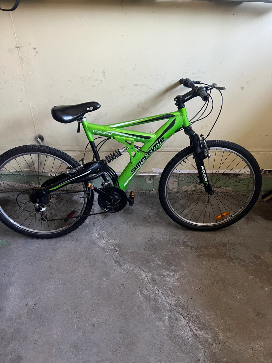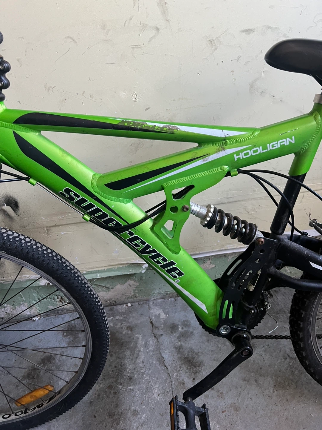 This is a green Supercycle Hooligan mountain bike. It has front and rear suspension for a smoother ride. Perfect for trail rides or casual cycling.