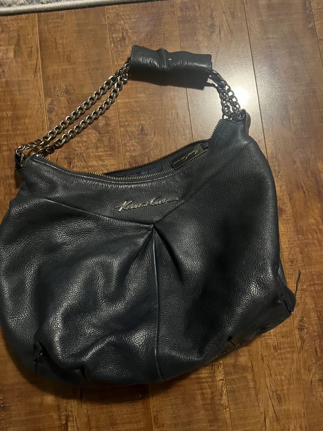 This is a blue leather shoulder bag by Kenneth Cole. It features a slouchy design with a pleated front and silver-tone chain strap accents. The interior is lined and includes a zip pocket.