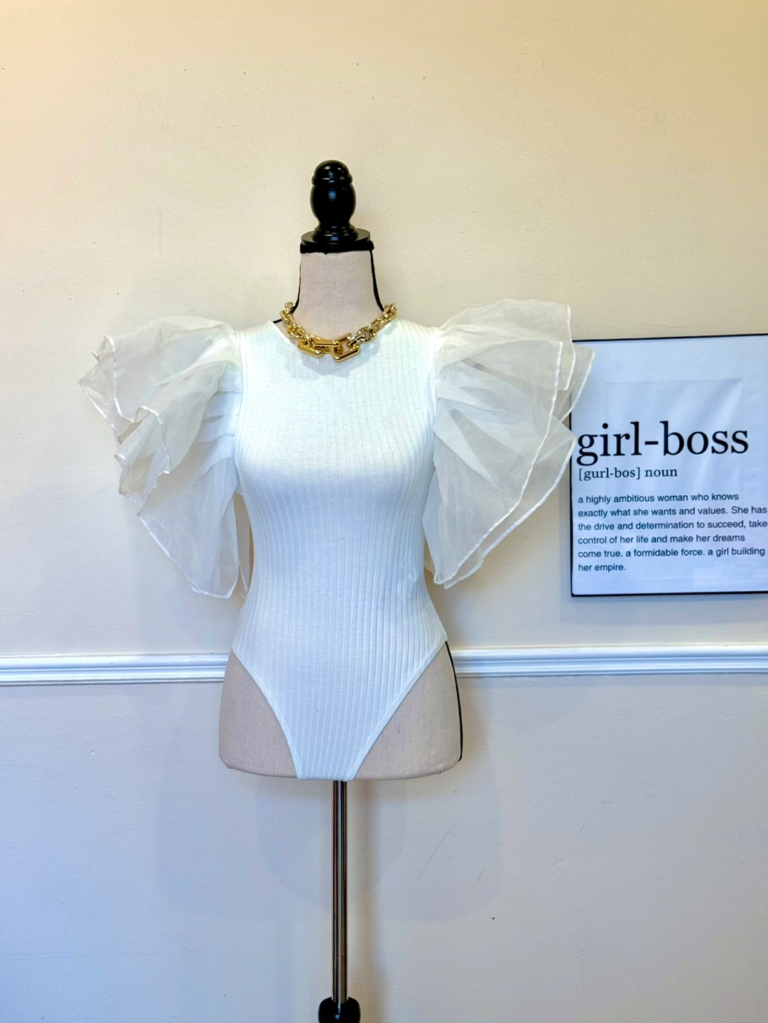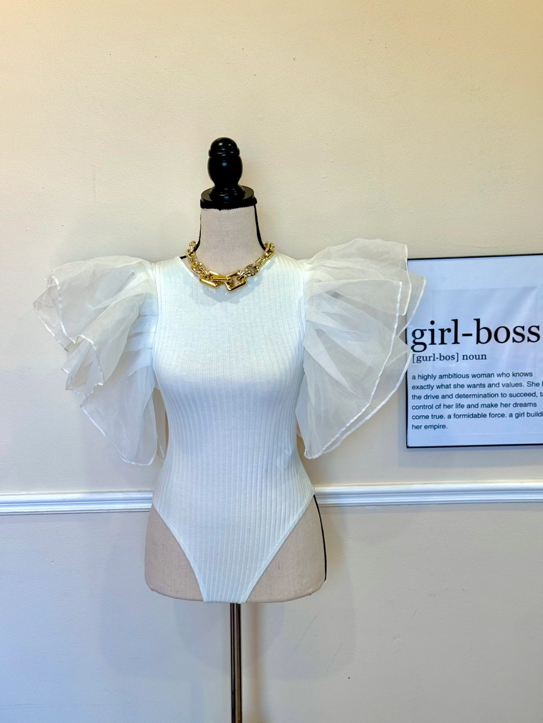 White bodysuit with sheer puff sleeves. Sleeves are ruched and gathered. Sleeves extend to the elbows.
