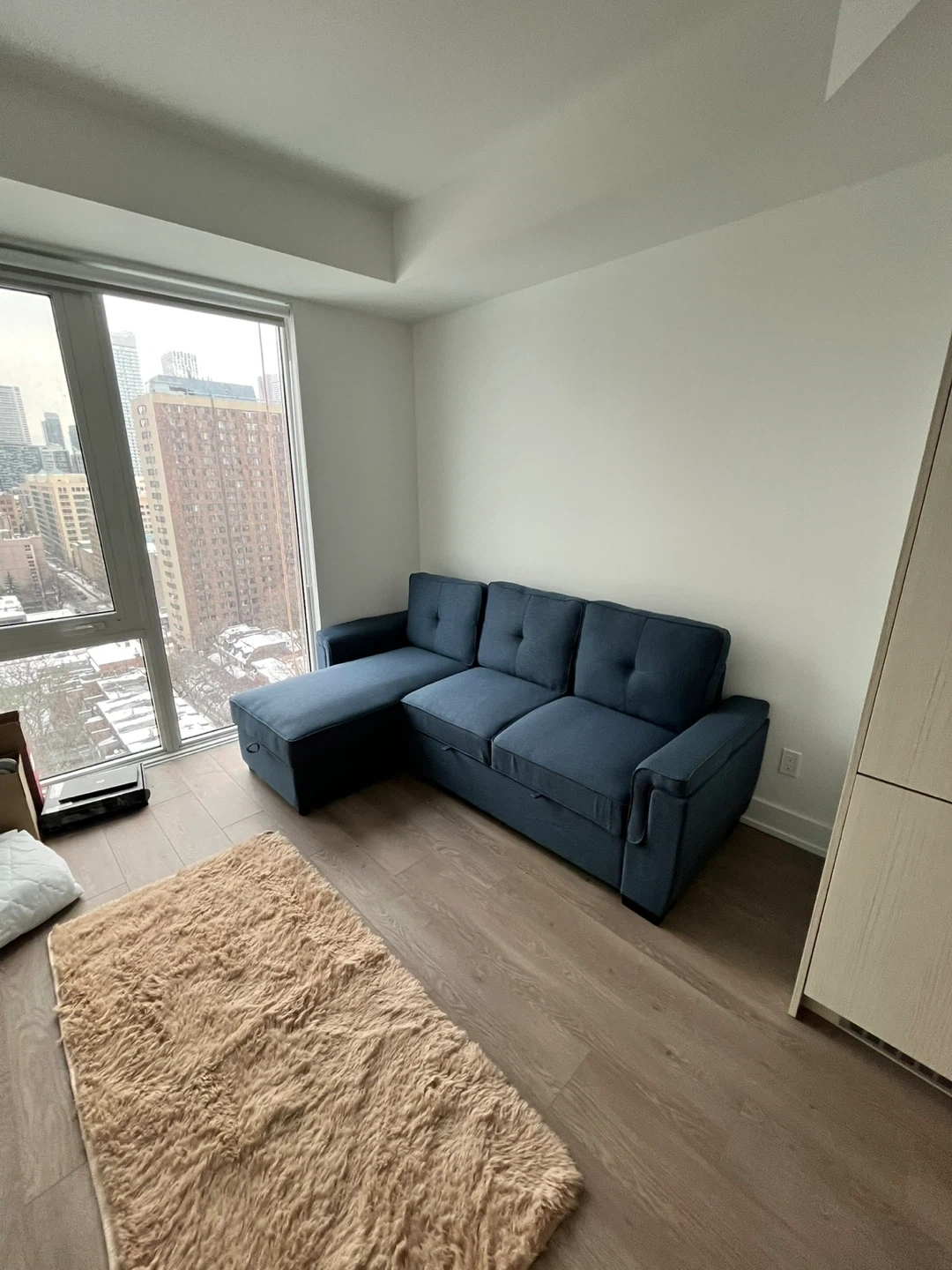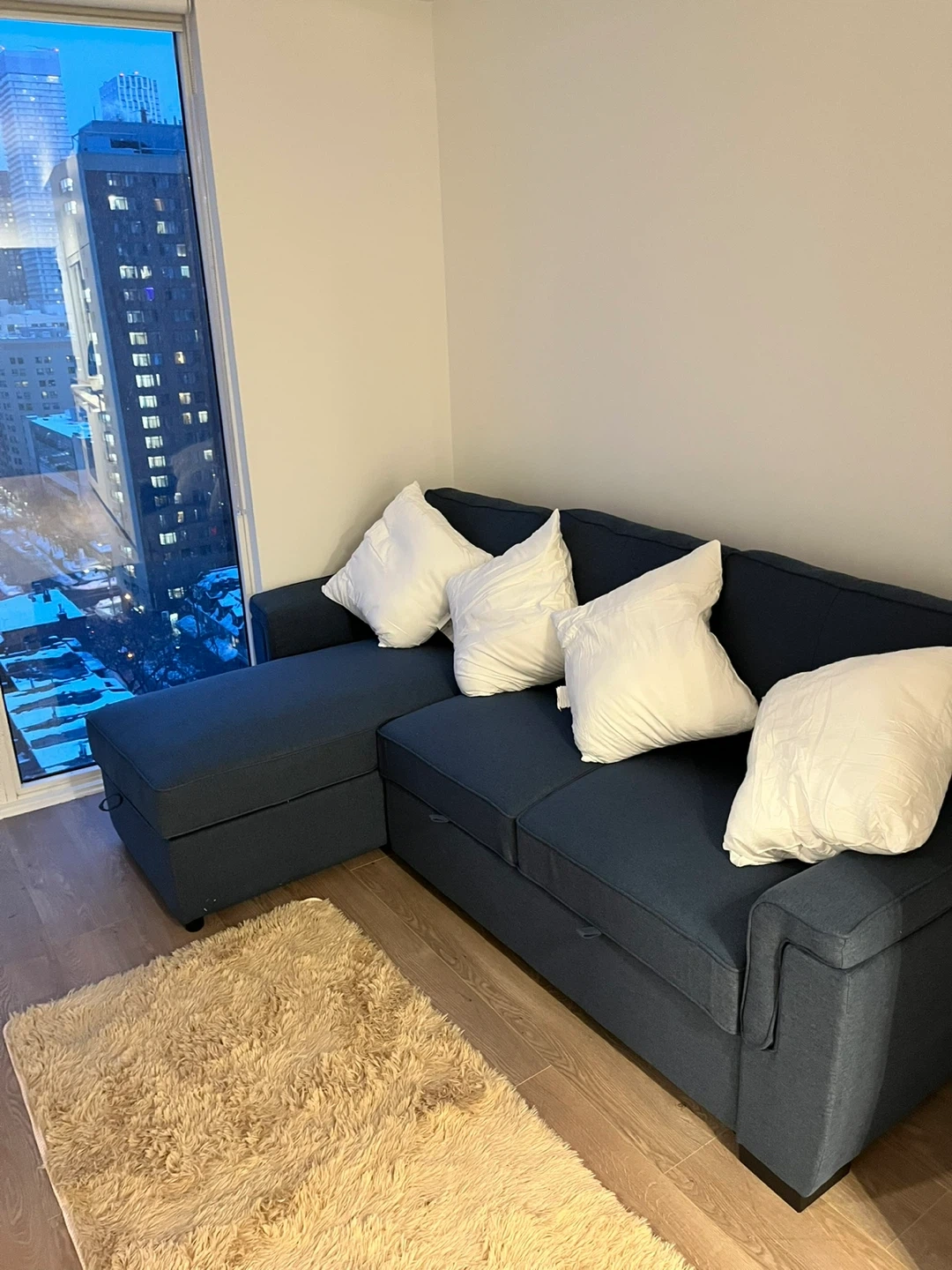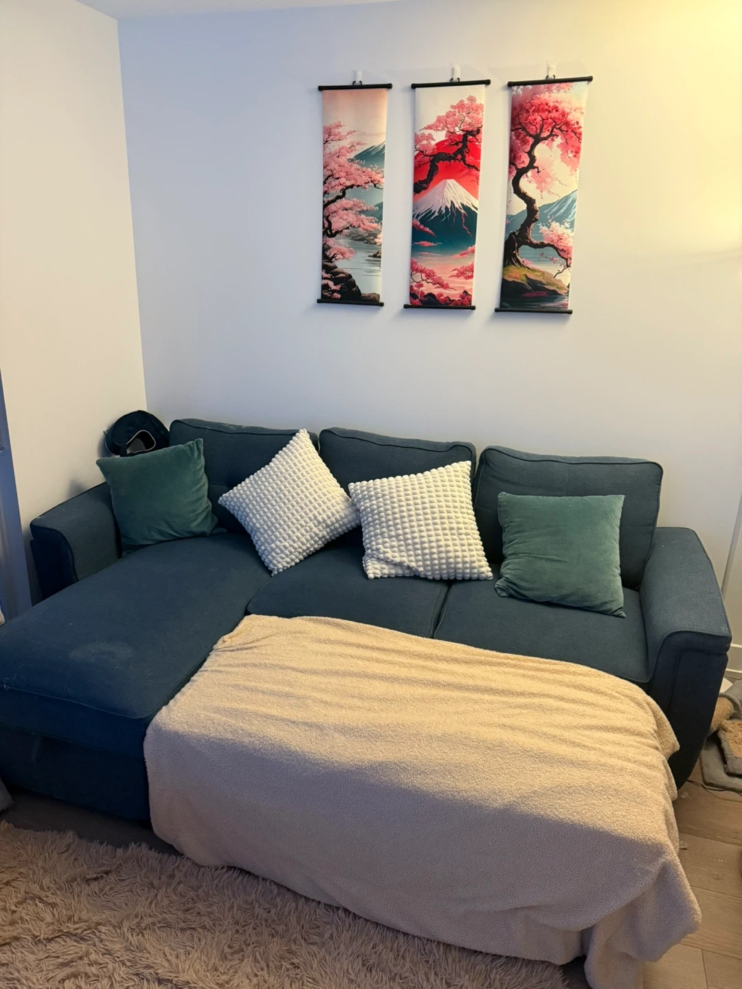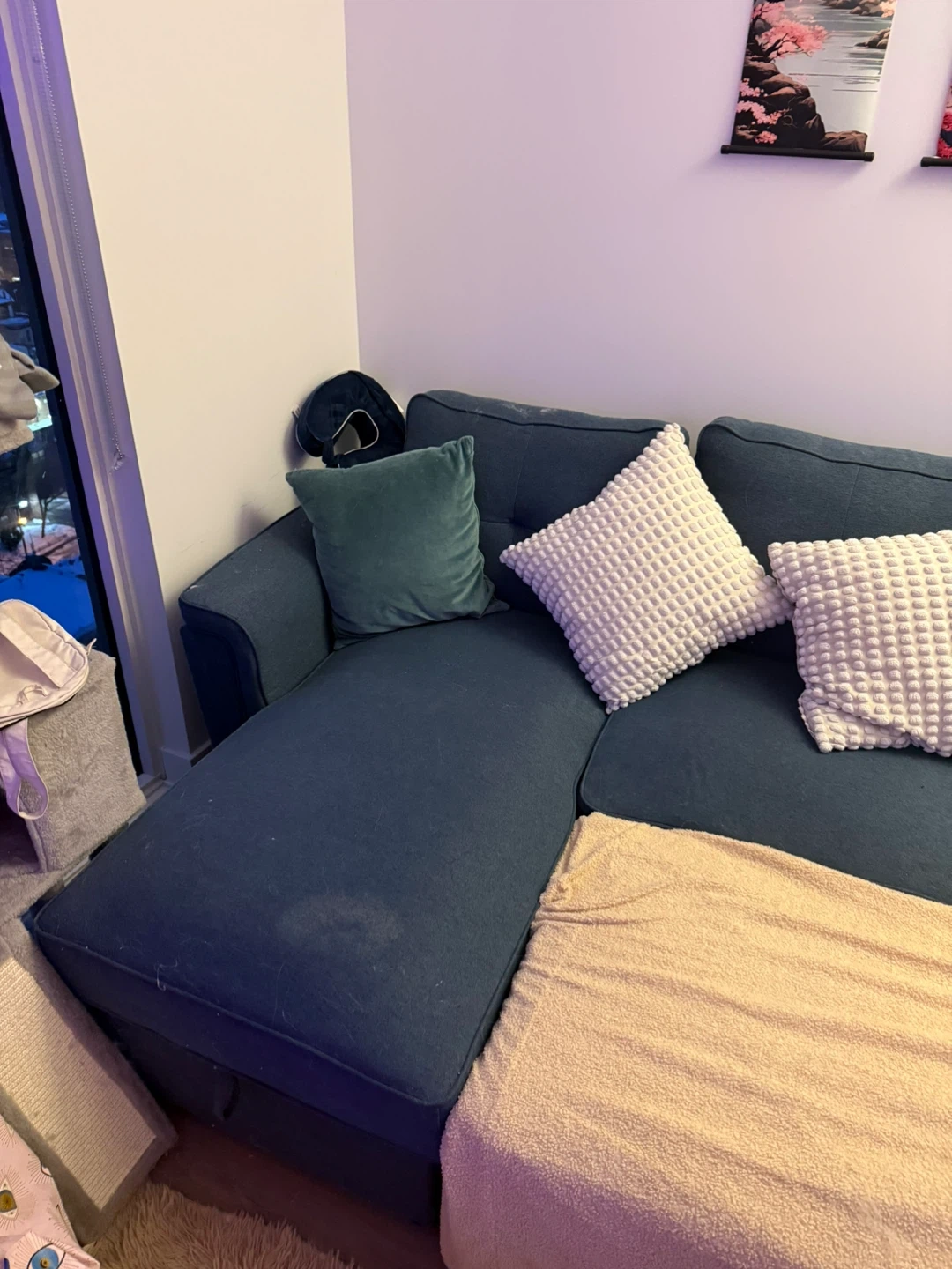 Comfy blue sectional sofa with a chaise lounge! Perfect for relaxing and adding a pop of colour to your living space. It's in good condition and ready for a new home.