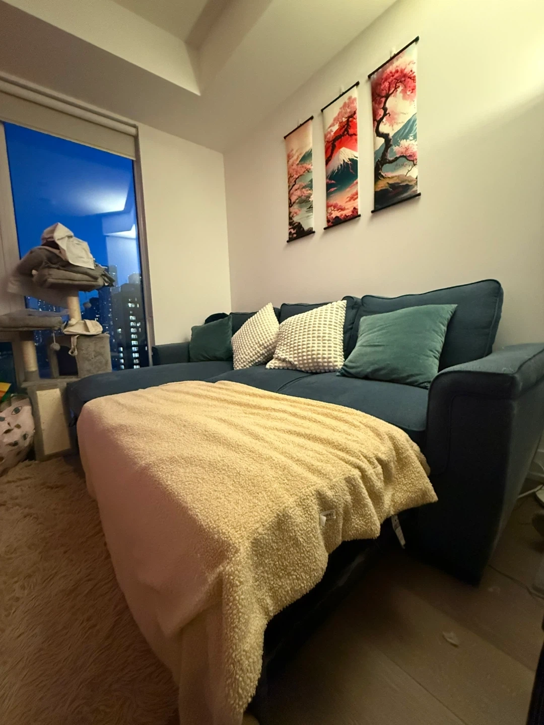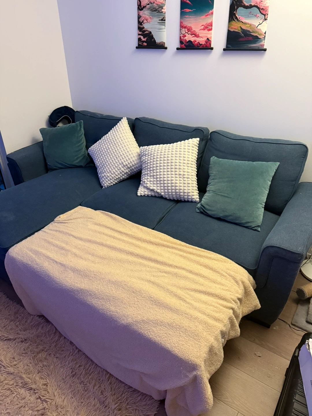 Comfy blue sectional sofa with a chaise lounge! Perfect for relaxing and adding a pop of colour to your living space. It's in good condition and ready for a new home.