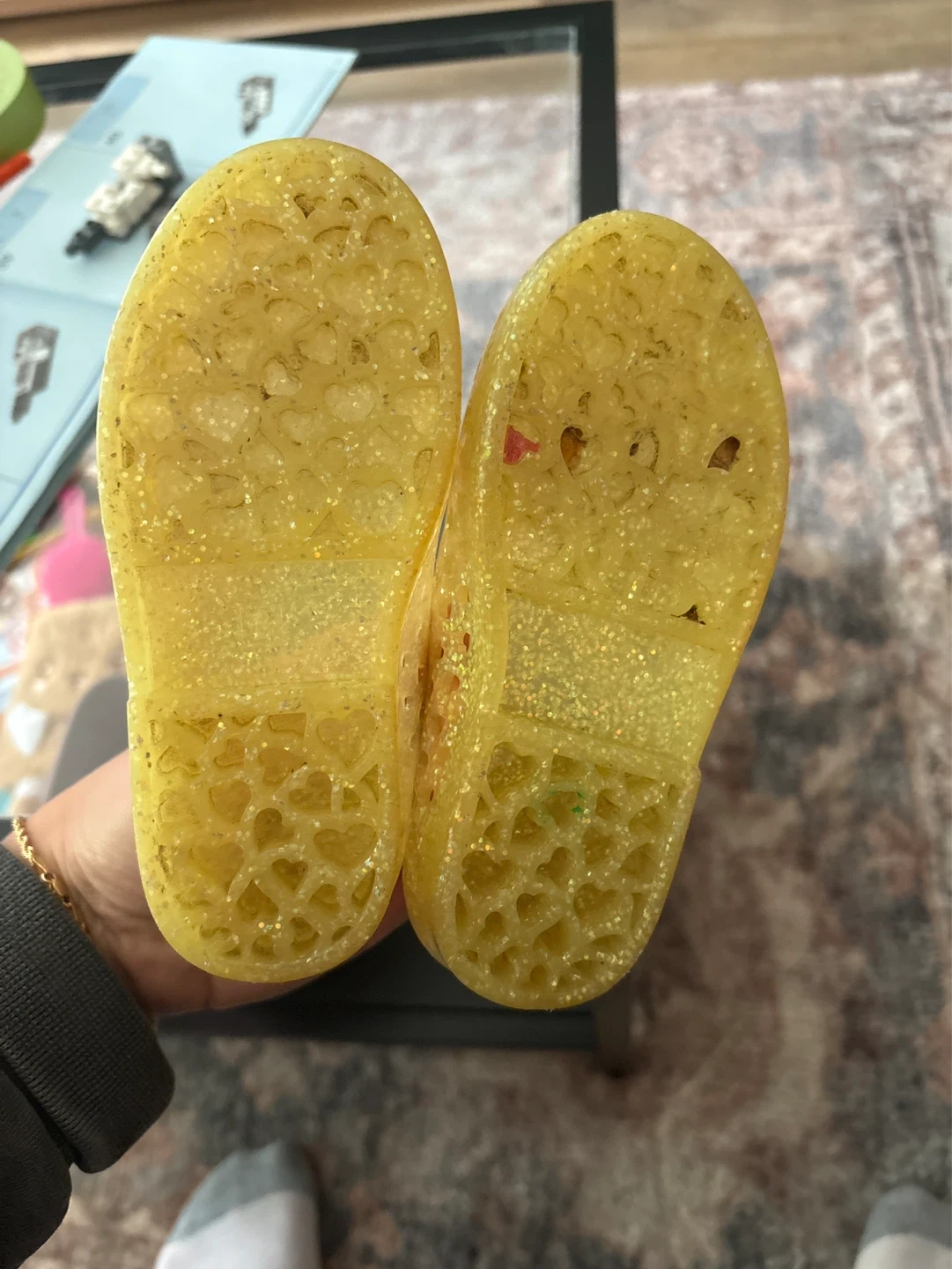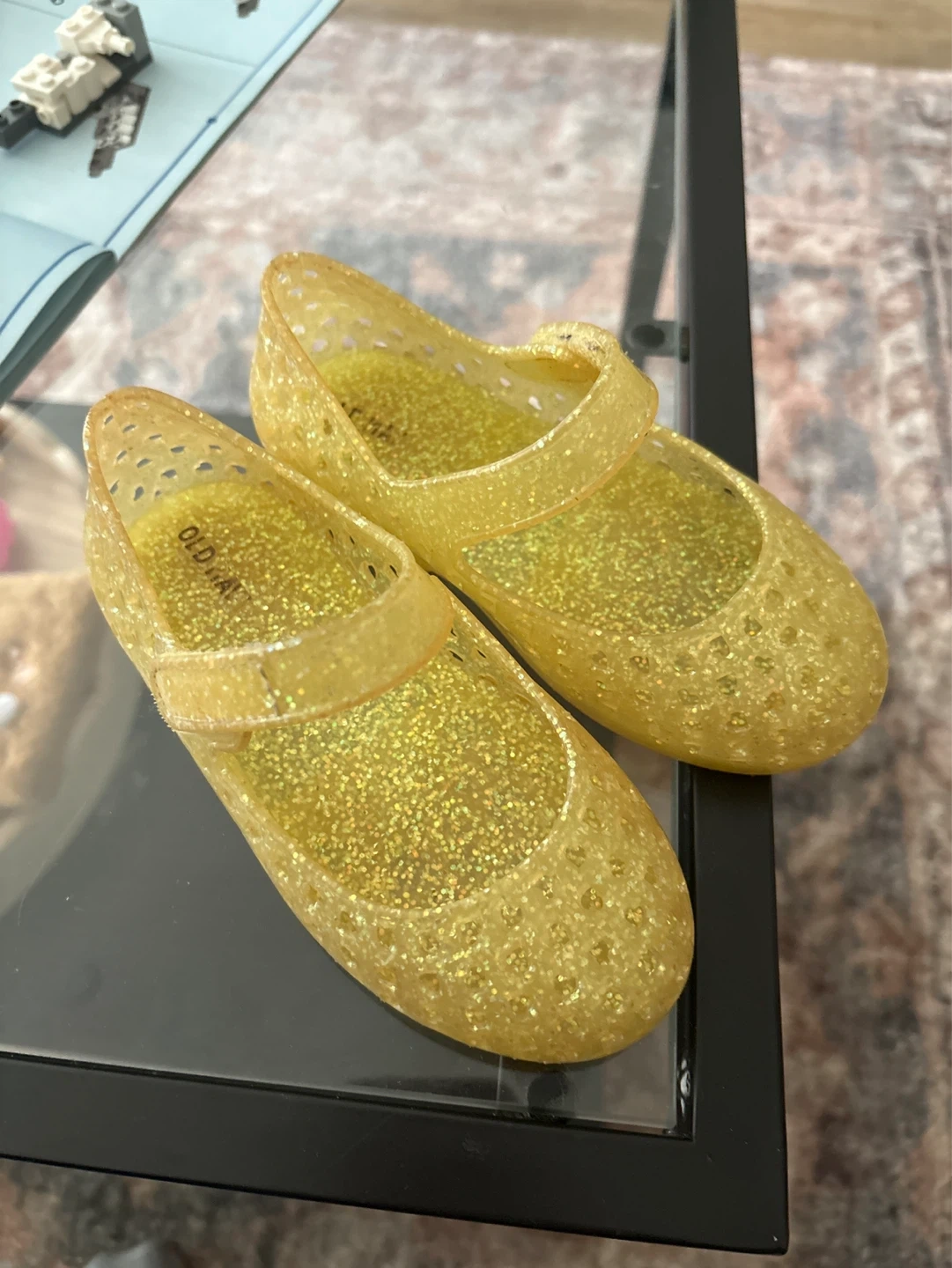 Cute yellow glitter jelly Mary Jane shoes from Old Navy. They have a classic strap closure and are made of a flexible, waterproof material. Perfect for summer days or playing outdoors!
