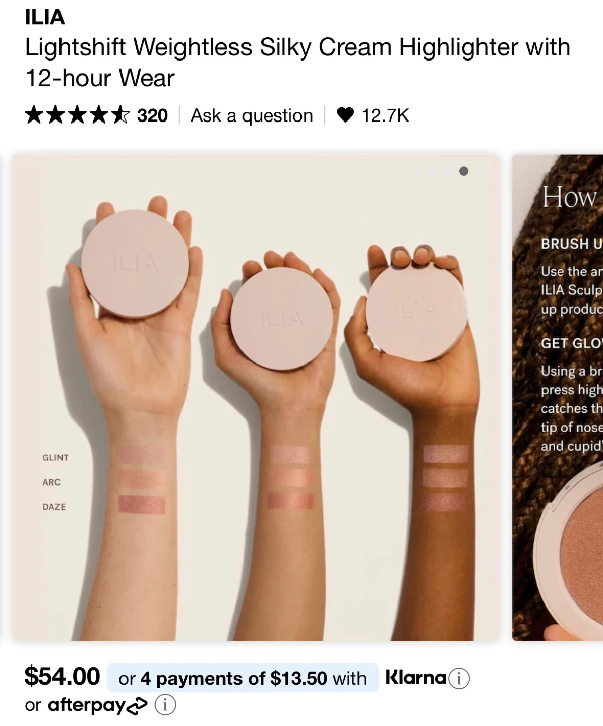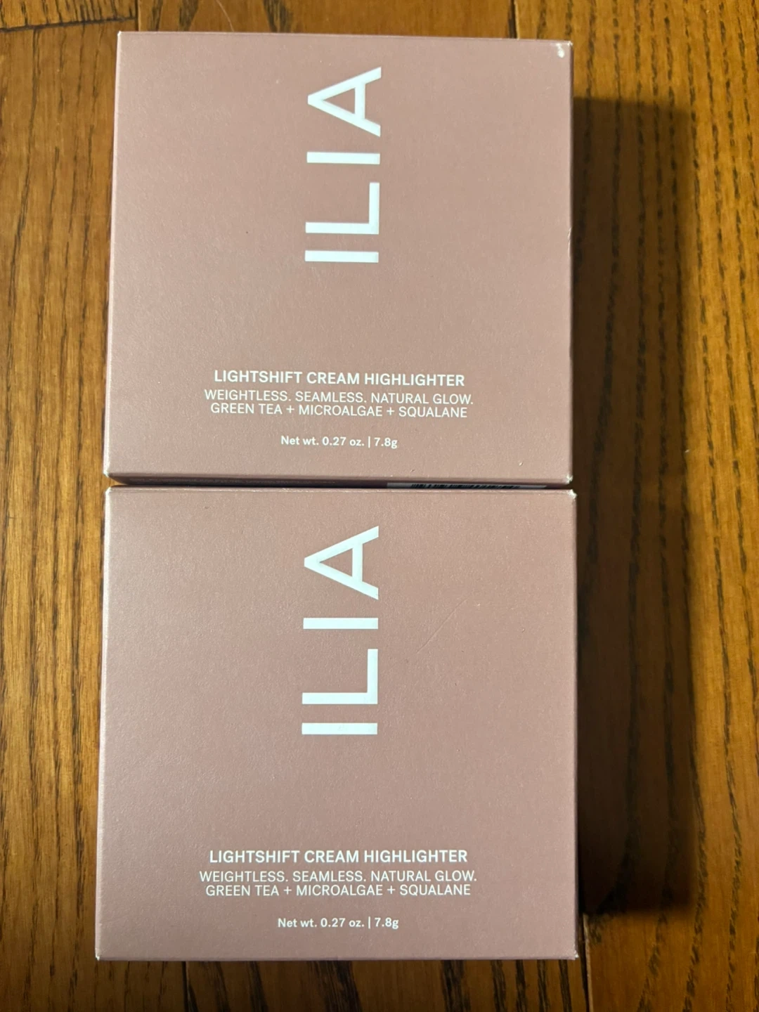 ILIA Lightshift Cream Highlighters in shades Glint and Daze. Each is weightless and provides a seamless, natural glow. Net wt. 0.27 oz. / 7.8g each.