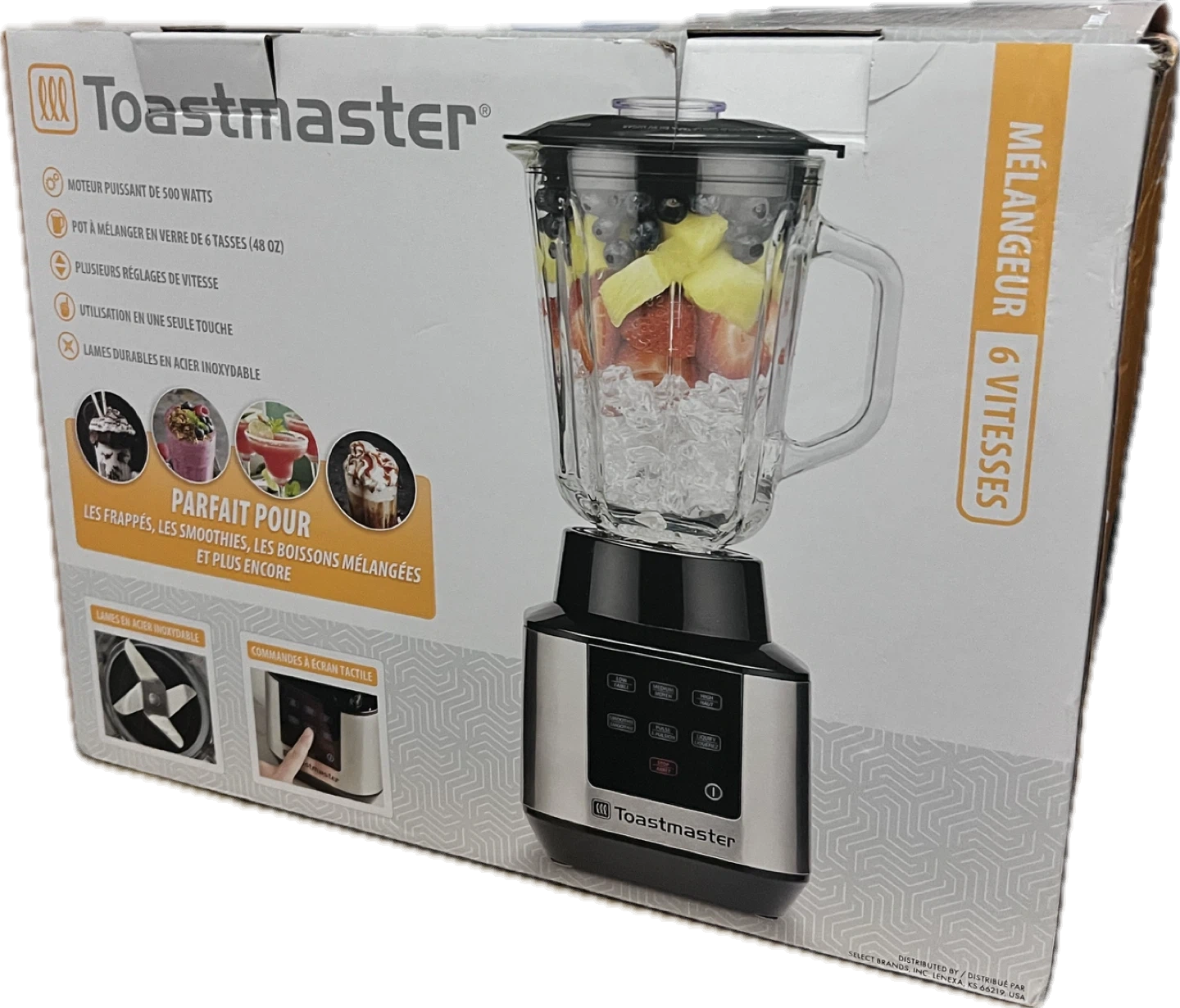 This Toastmaster blender has 6 speeds and durable stainless steel blades. It comes with a 48 oz glass jar. Perfect for smoothies, shakes, and more!