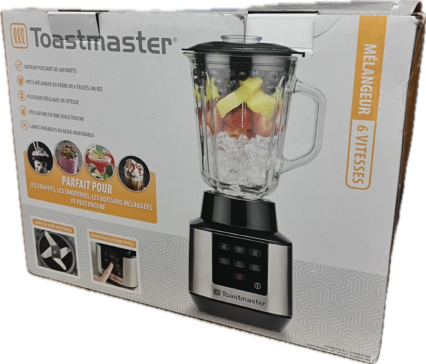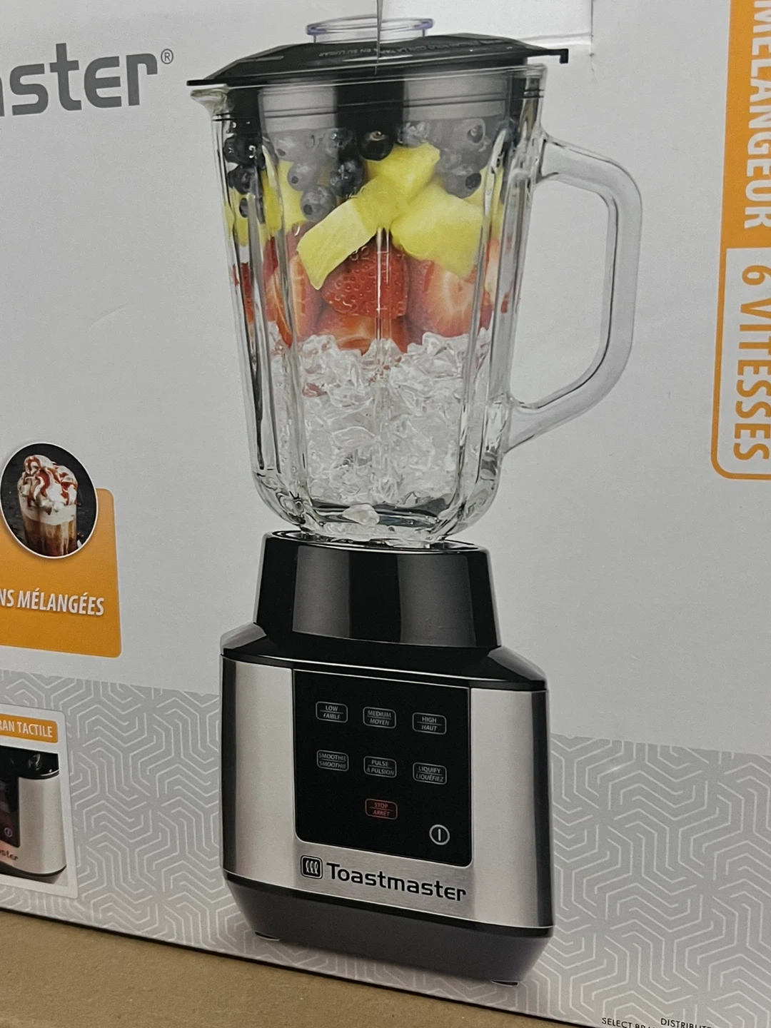 This Toastmaster blender has 6 speeds and durable stainless steel blades. It comes with a 48 oz glass jar. Perfect for smoothies, shakes, and more!