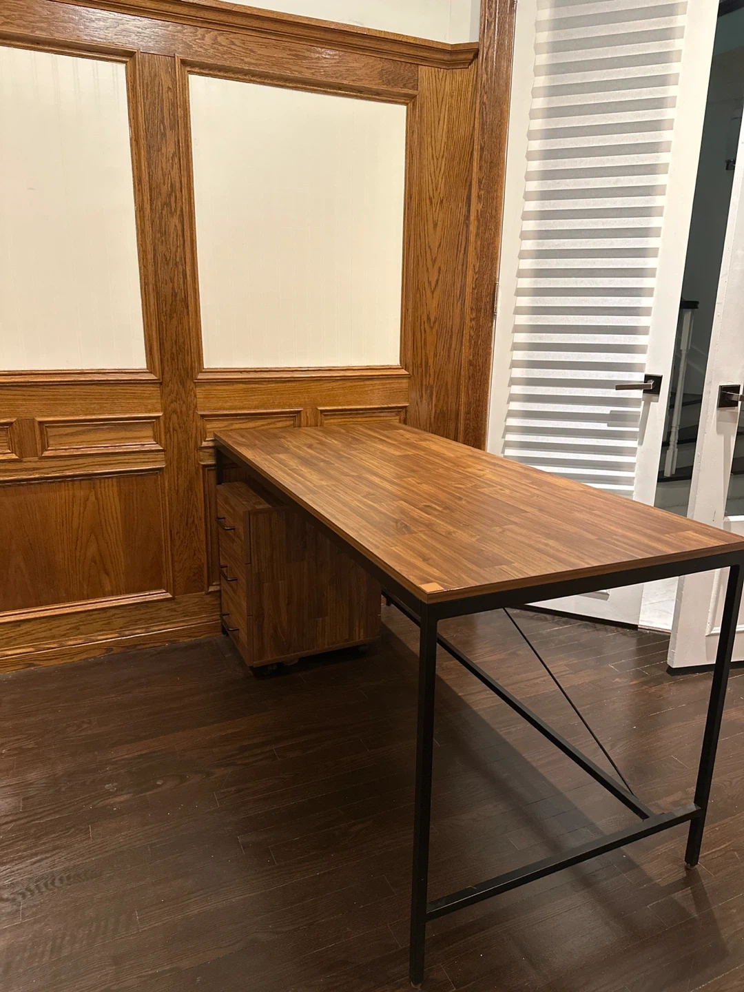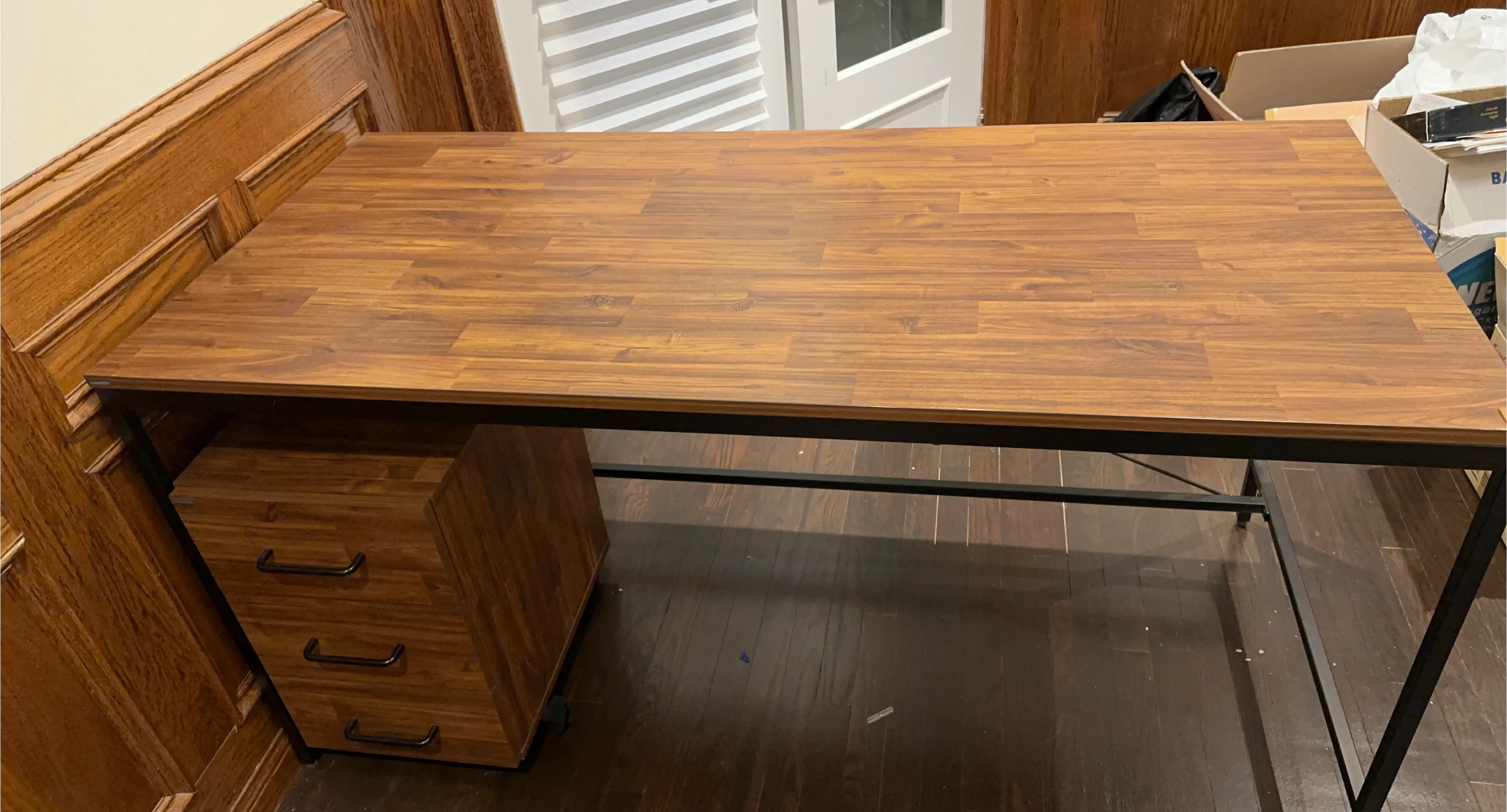 This desk has a wooden top and a black metal frame. It comes with a three-drawer unit attached to one side. The surface is a warm wood tone. A good desk and bookshelf for a home office setup.