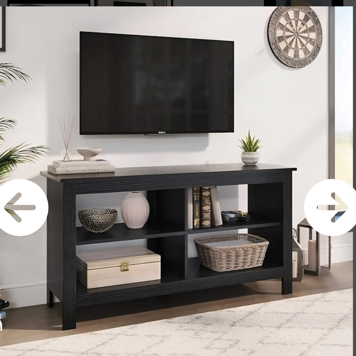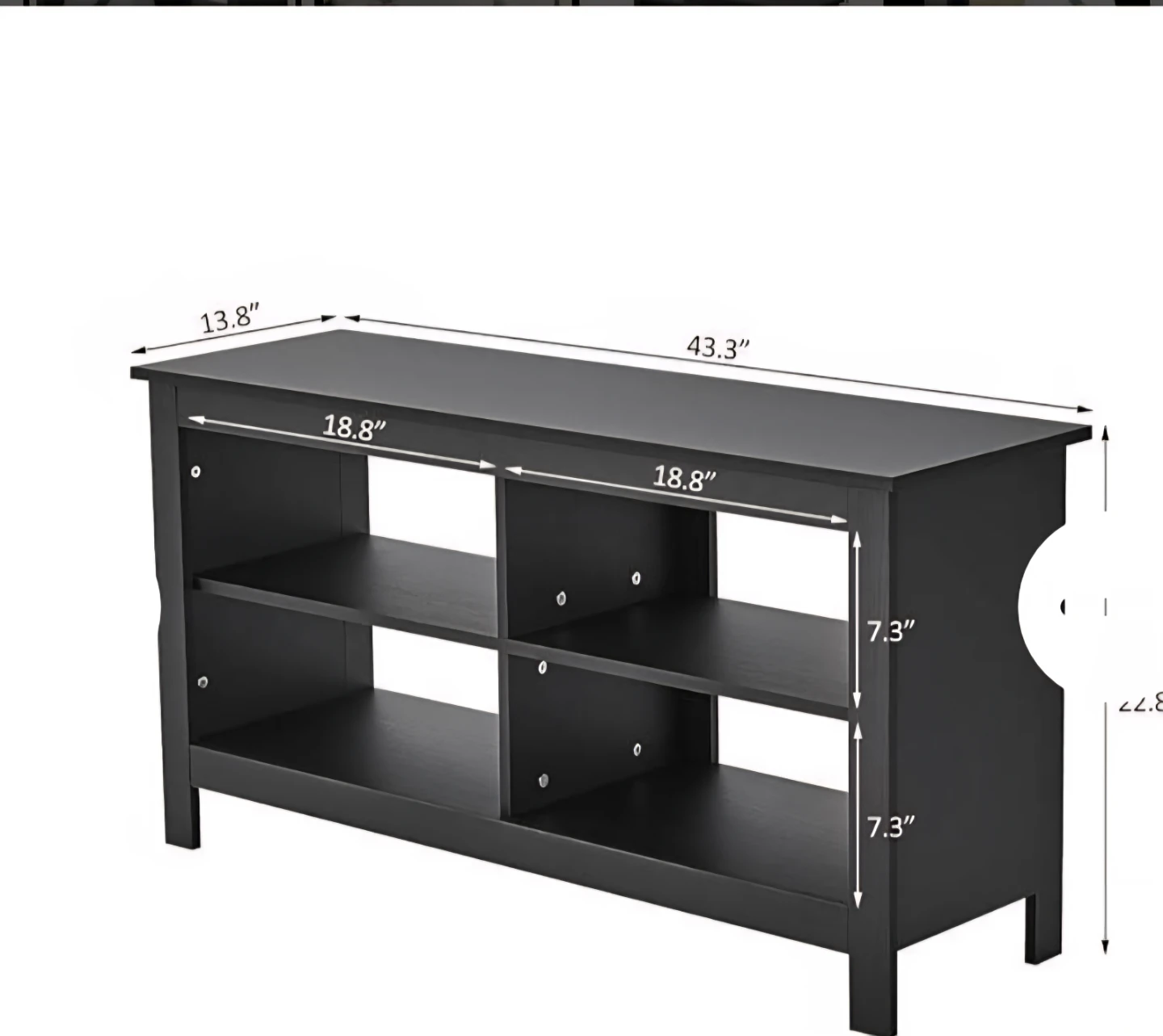 A black TV stand featuring multiple open shelves for storage. Dimensions are 43.3" wide, 13.8" deep, and 22.8" high. Shelf height is 7.3". It's a solid piece, perfect for organizing media consoles and accessories.