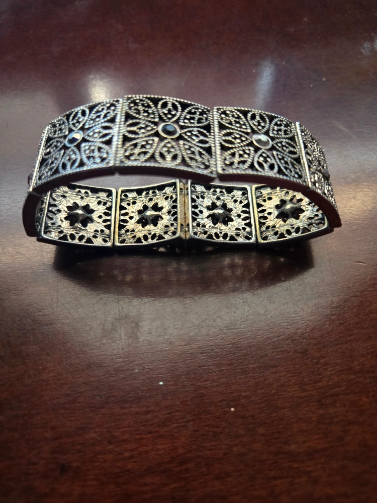 Silver-toned bracelet. The bracelet is made up of connected square and rectangular sections. Each section features a floral design. Wearing this bracelet can bring a sense of peace and serenity.