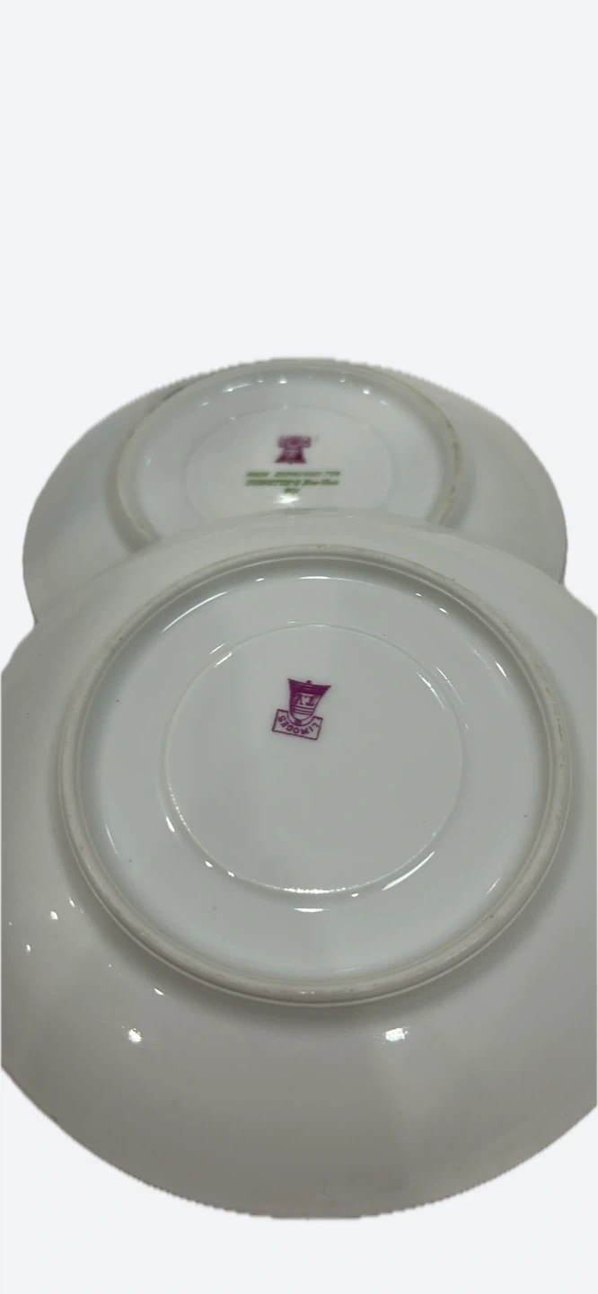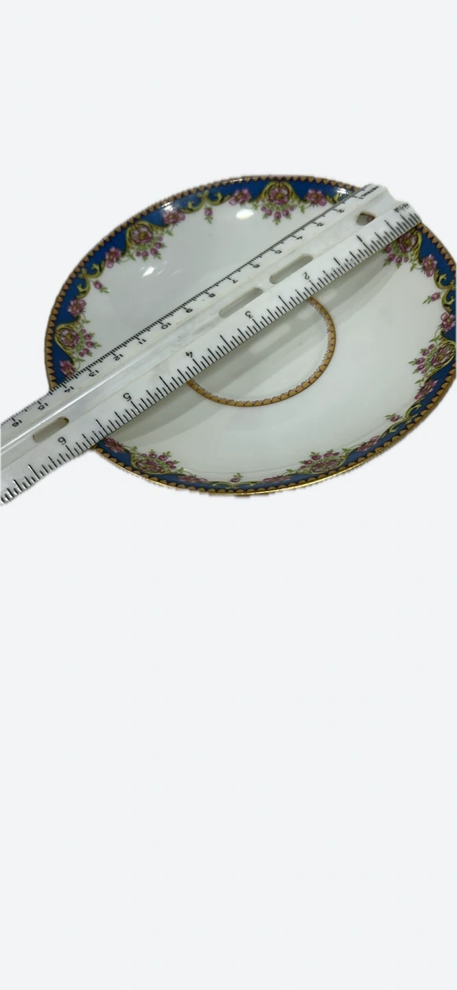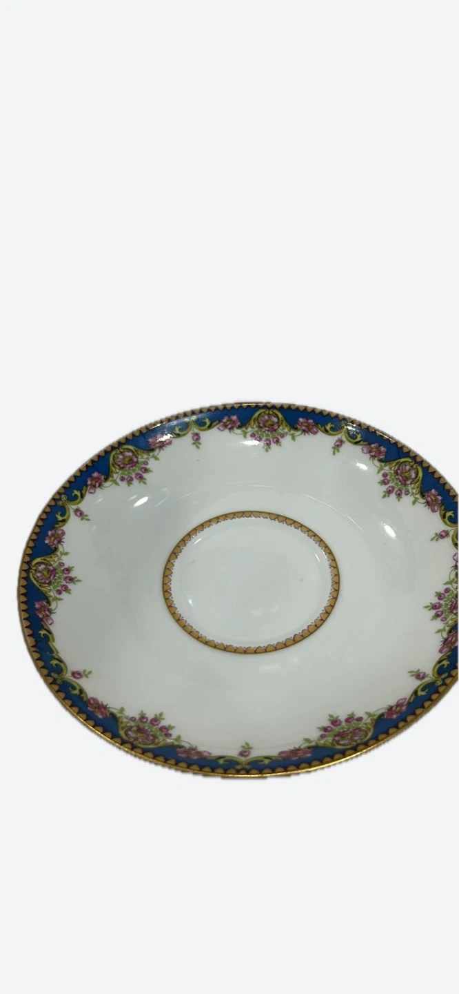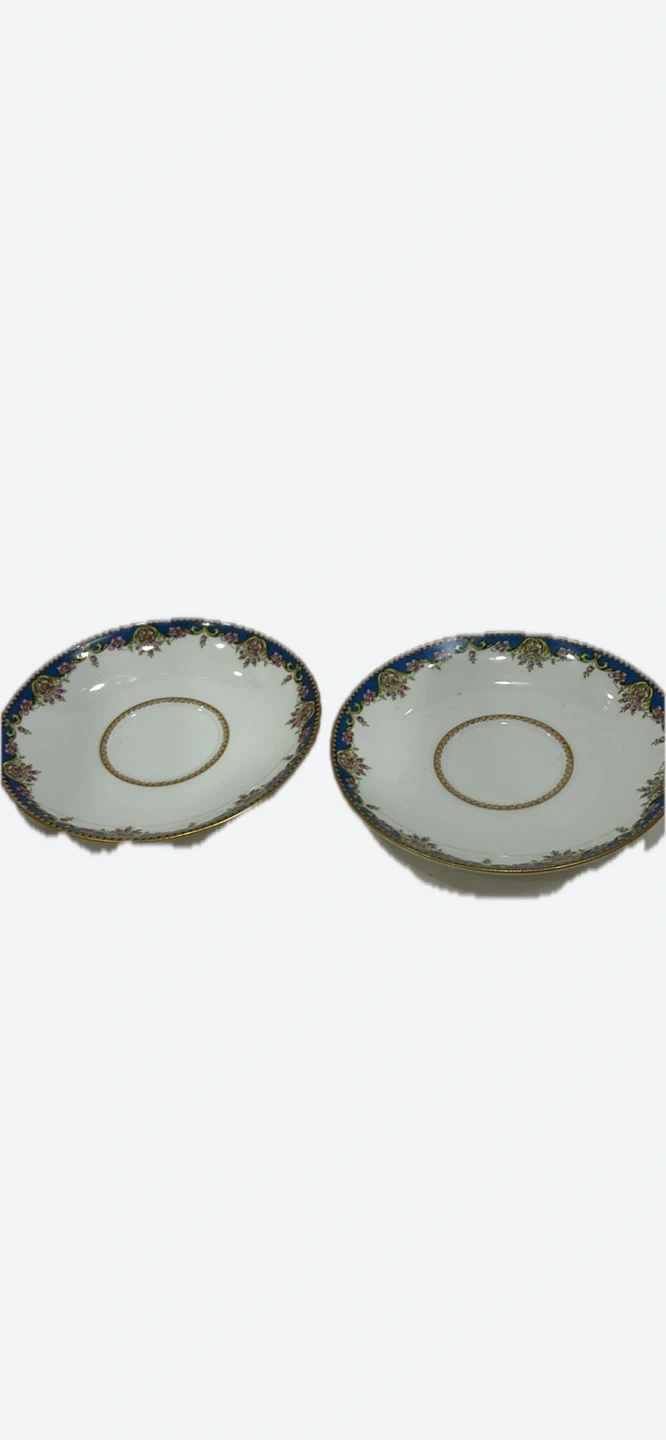 Limoges T.V two vintage porcelain saucers from Ovington's New York. They feature a floral pattern with a blue and gold trim. Each saucer measures approximately 5.5 inches in diameter. These would be lovely for a tea party or as part of a collection! Pre owned