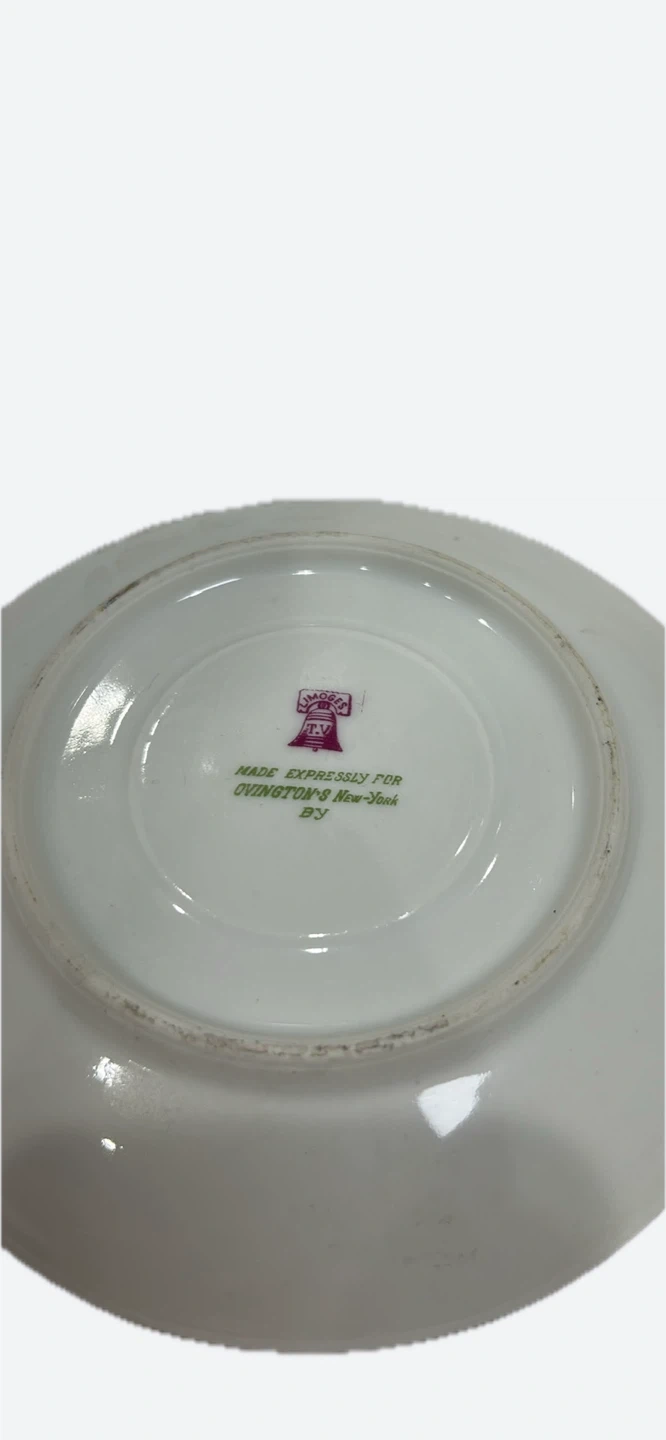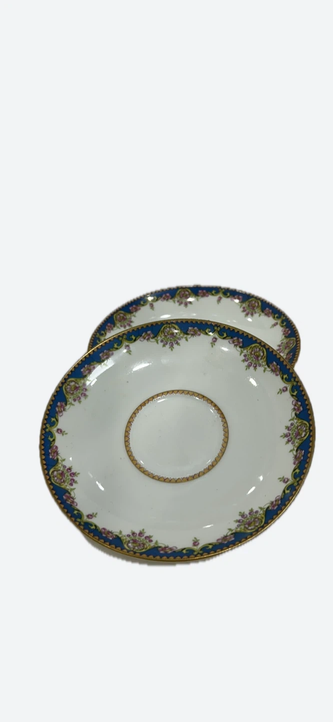 Limoges T.V two vintage porcelain saucers from Ovington's New York. They feature a floral pattern with a blue and gold trim. Each saucer measures approximately 5.5 inches in diameter. These would be lovely for a tea party or as part of a collection! Pre owned