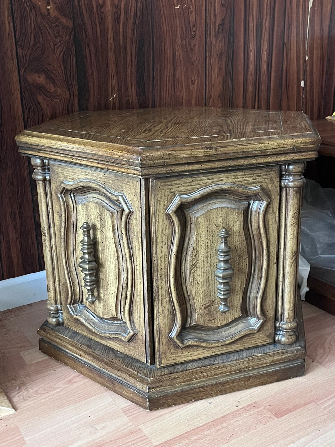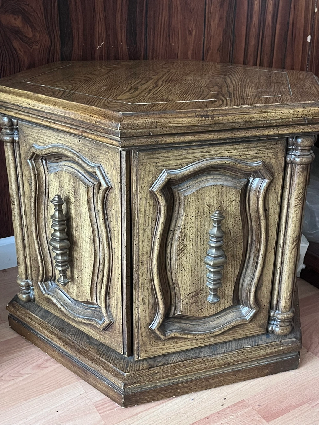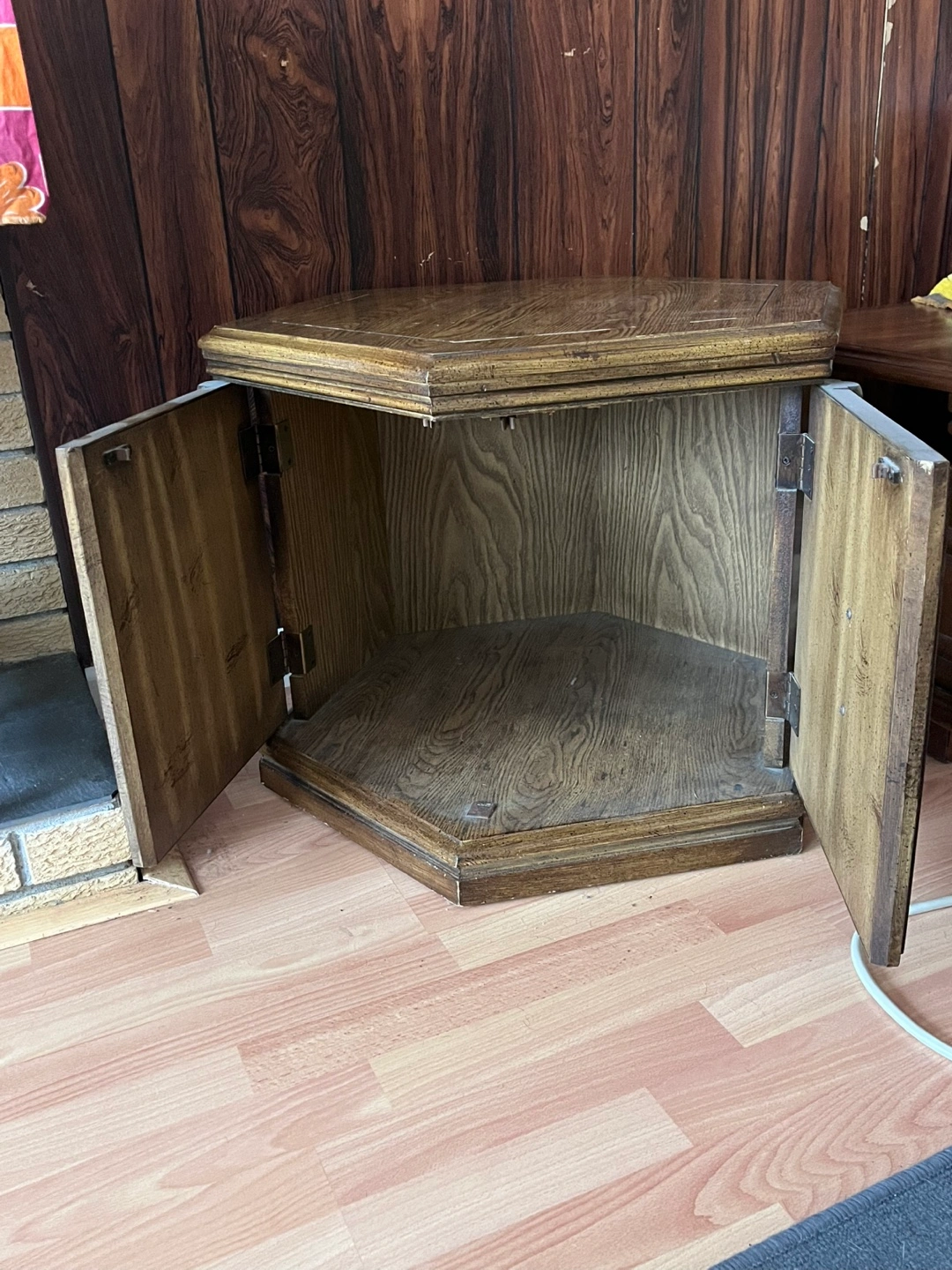 Selling a lovely vintage hexagonal side table. It has a unique design with detailed carvings and a warm, wood finish. Perfect for adding a touch of classic charm to any room!