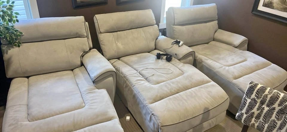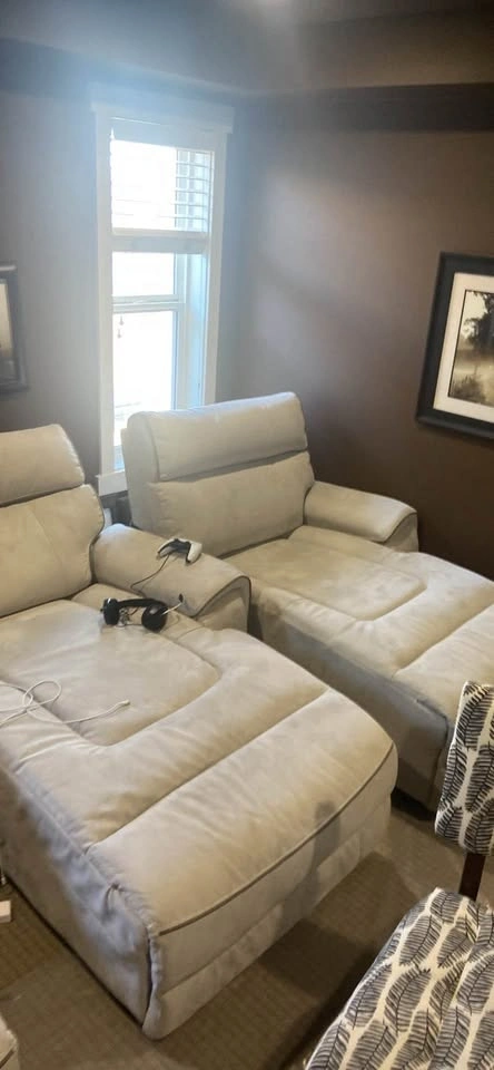 Super clean sofas from a smoke-free home. Bought for $1600 last year, looking to sell for $400 each. Little scratches on the USB spots, but they can likely be removed with rubbing alcohol. Features automatic recliner for back and forward movement. I steam wash them about once a month to keep them clean. No bad spots on the sofas at all!