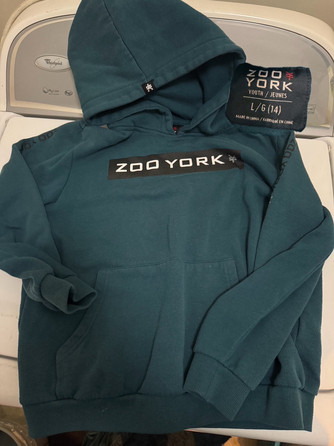Selling a Zoo York youth hoodie in size L/G (14). It's in great condition and perfect for keeping warm on cooler days. The hoodie features the Zoo York logo on the front and sleeve.