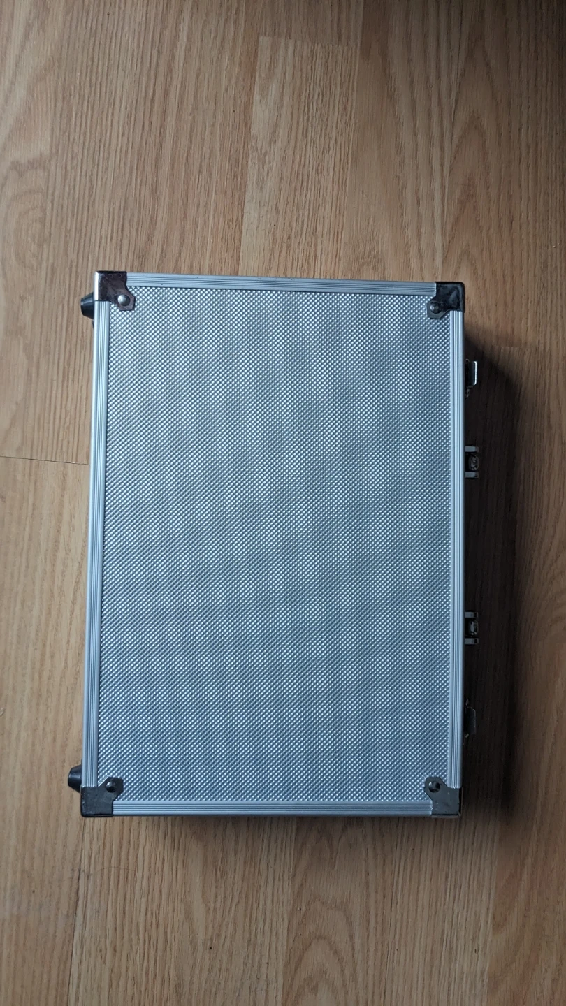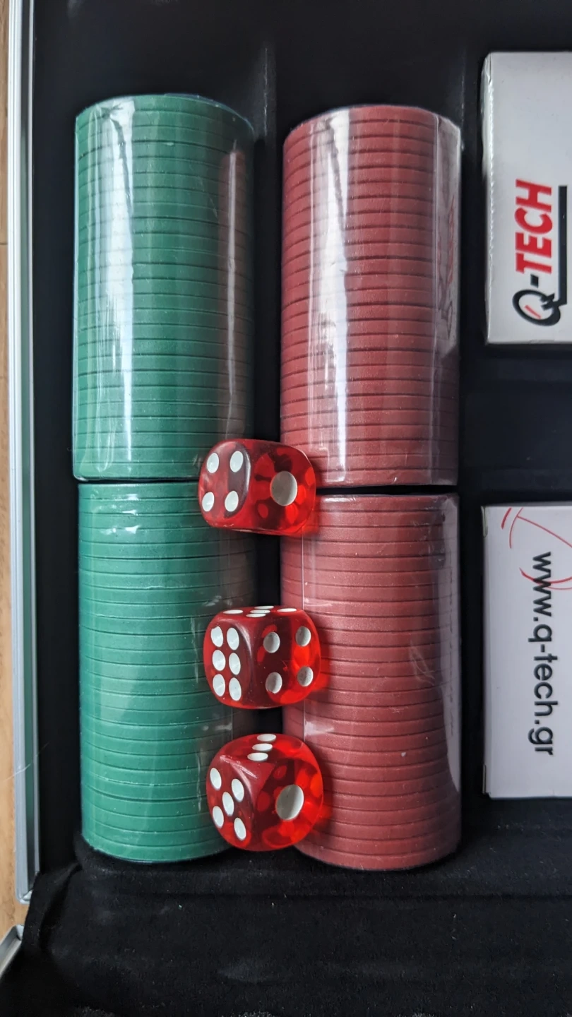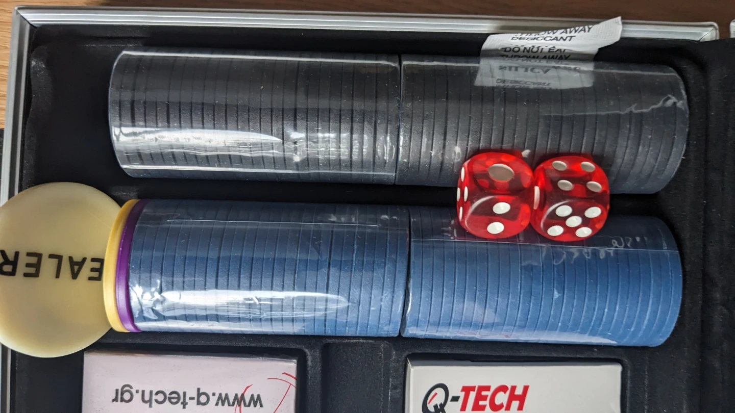 This Q-TECH poker chip set comes in a durable silver case. It includes multiple stacks of poker chips in various colours, dice, and dealer buttons. Get ready for your next game night!