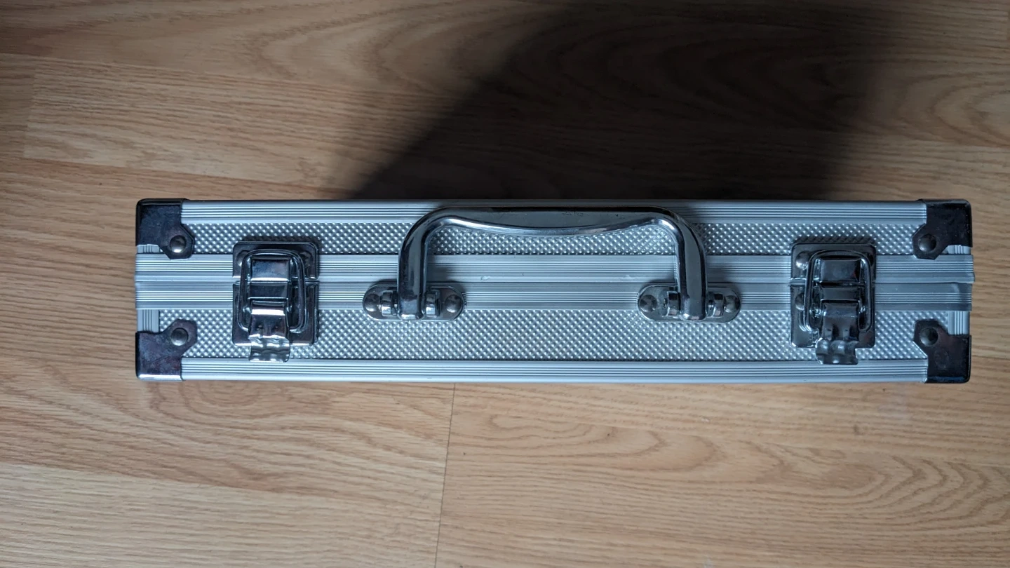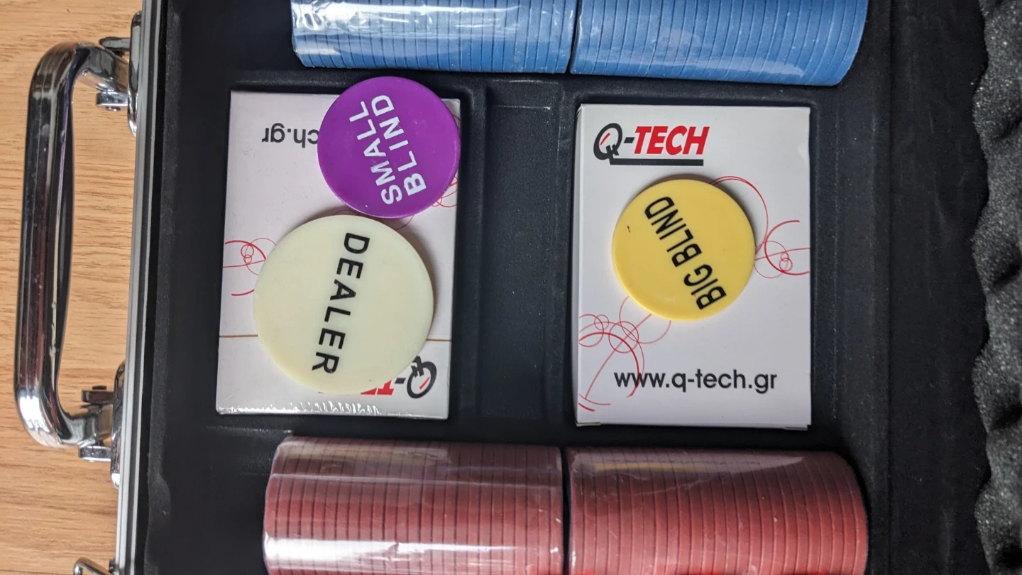 This Q-TECH poker chip set comes in a durable silver case. It includes multiple stacks of poker chips in various colours, dice, and dealer buttons. Get ready for your next game night!
