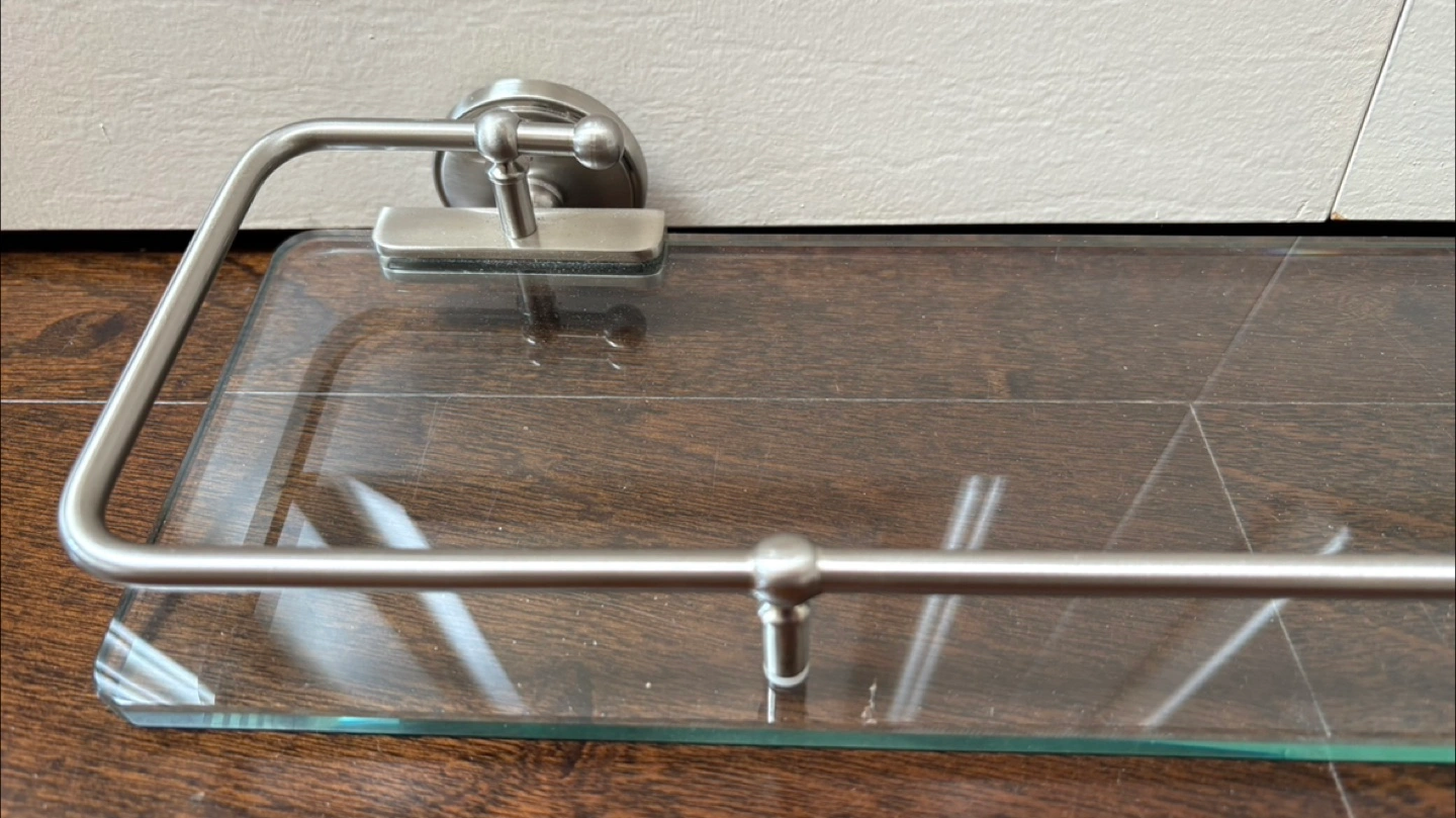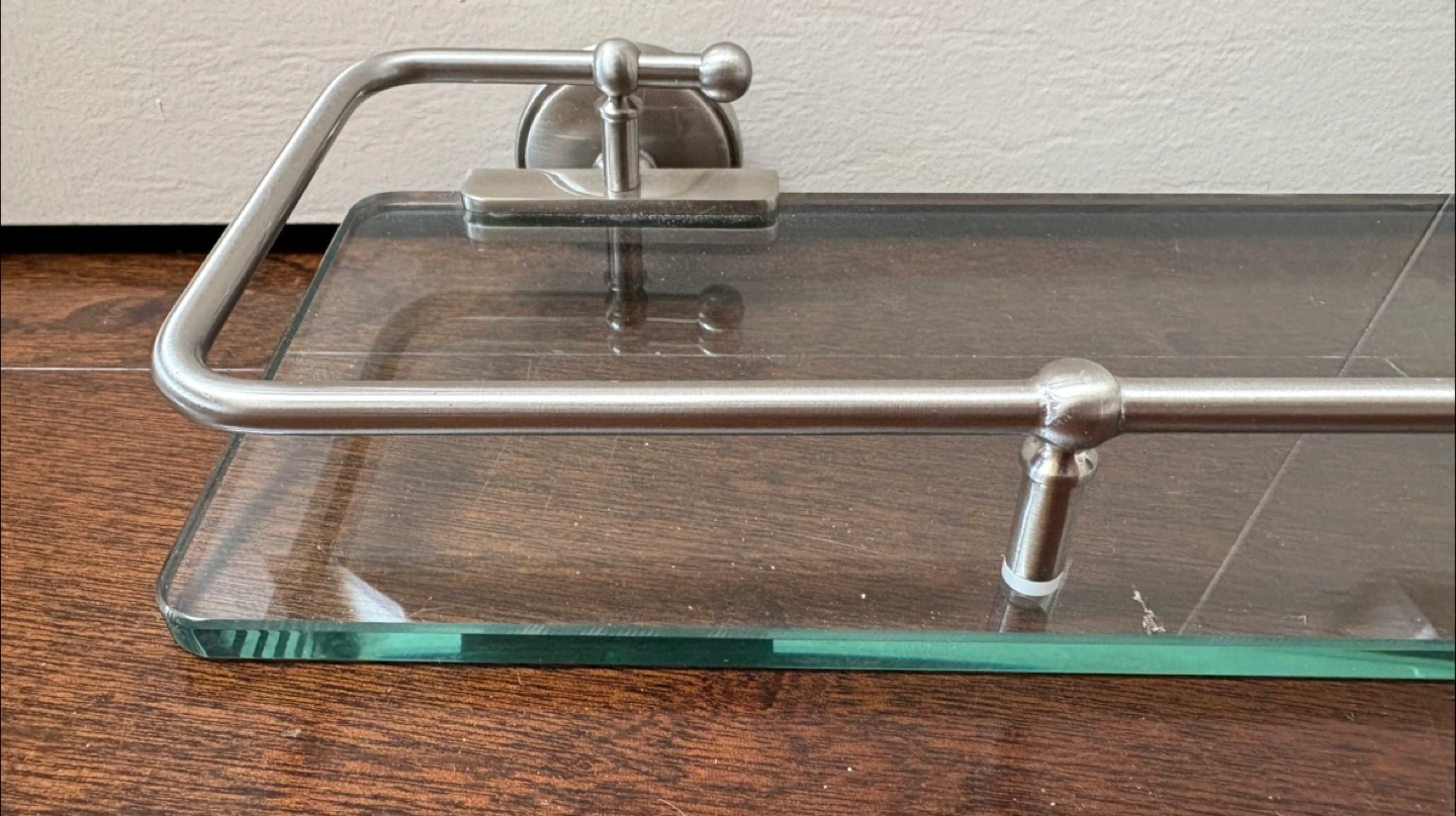 This is a glass shelf with a brushed metal railing.