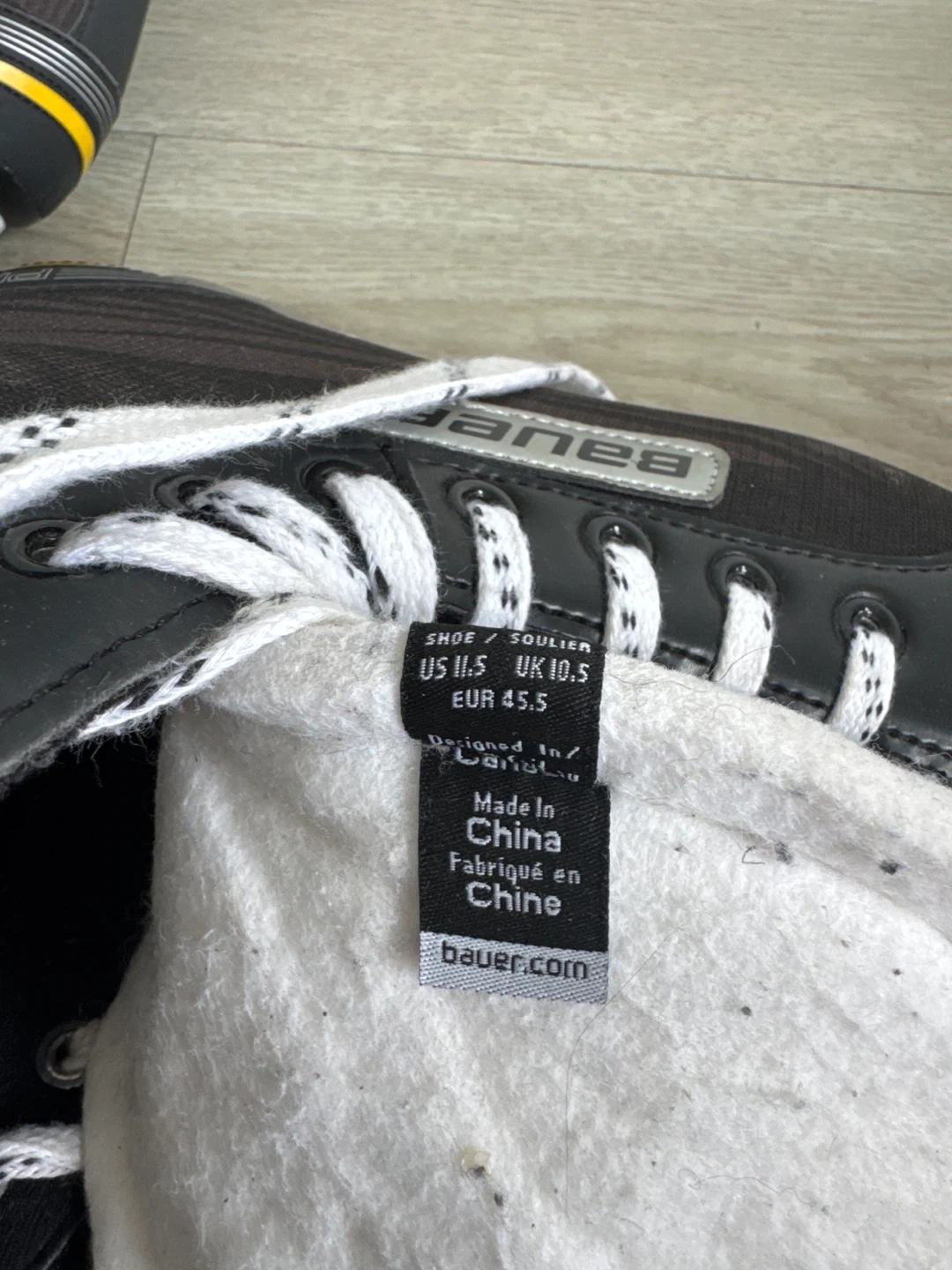Bauer Supreme hockey skates in black. Features white laces and white trim. Designed in Canada, made in China. Shoe size US 11.5, UK 10.5, EUR 45.5. Perfect for players hitting the ice!