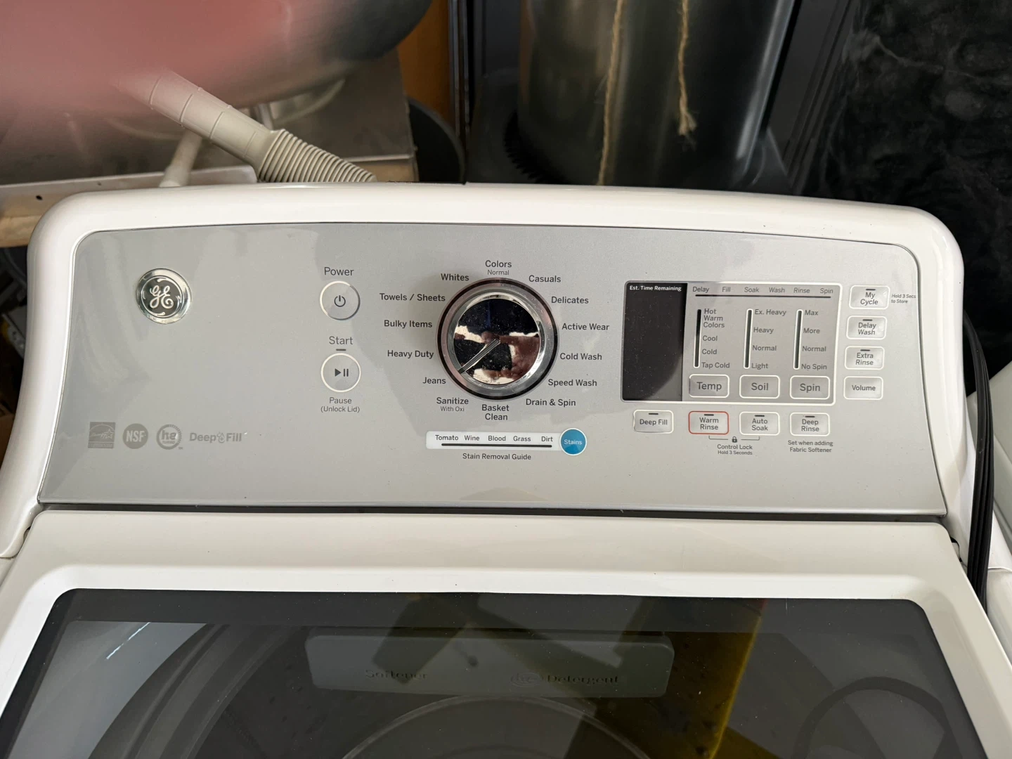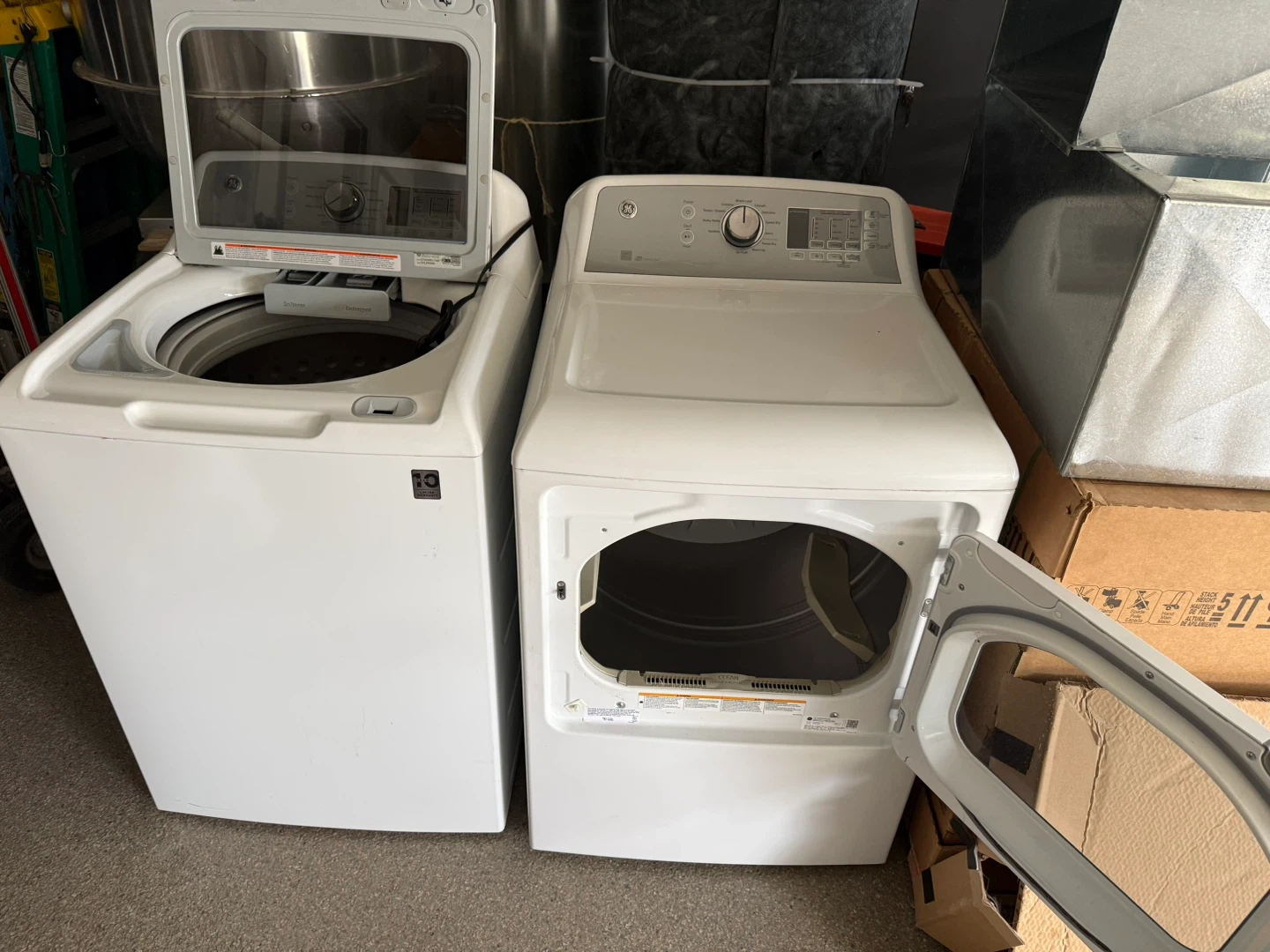 GE white top-loading washing machine and matching Dryer. It features multiple wash cycles and dry cycles and settings for different fabric types. Includes a softener dispenser and deep fill option.