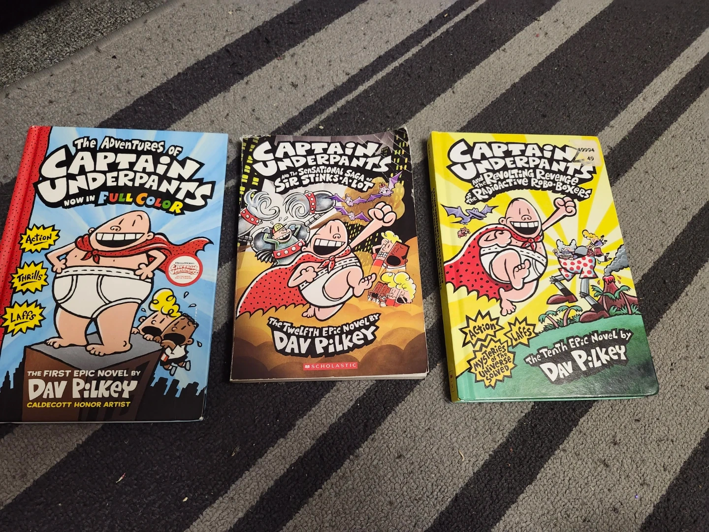 three popular Captain Underpants books by Dav Pilkey. The first book is a full-colour edition of "The Adventures of Captain Underpants". The other two are "Captain Underpants and the Sensational Saga of Sir Stinks-A-Lot" and "Captain Underpants and the Revolting Revenge of the Radioactive Robo-Boxers". These books are great for young readers who enjoy humour and adventure!