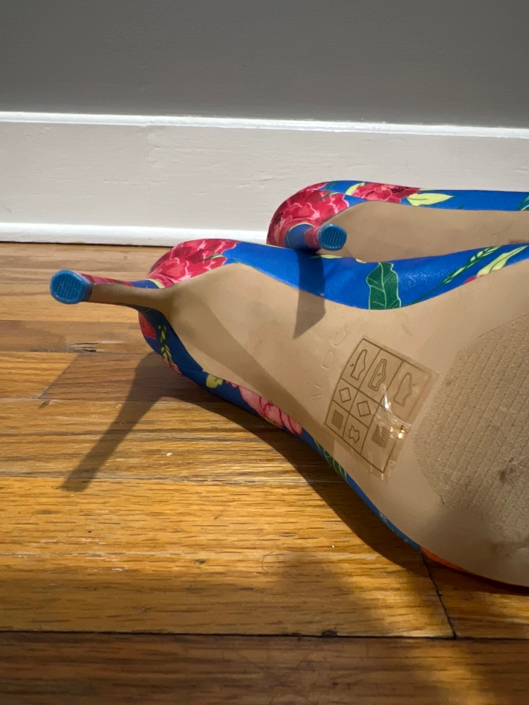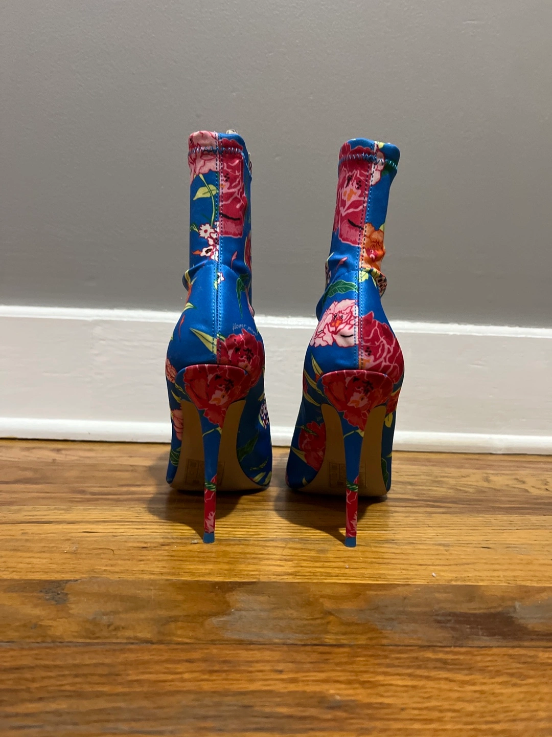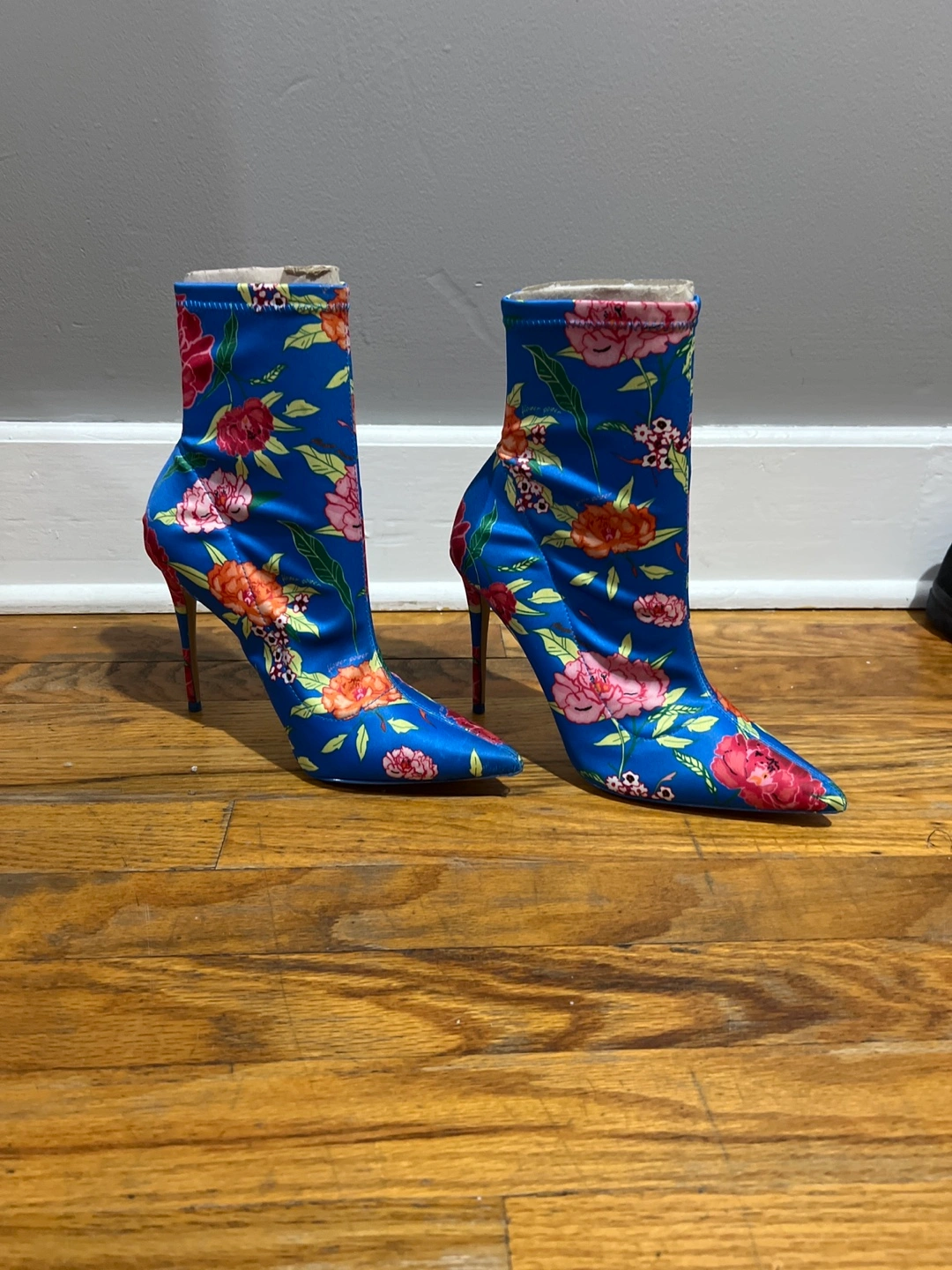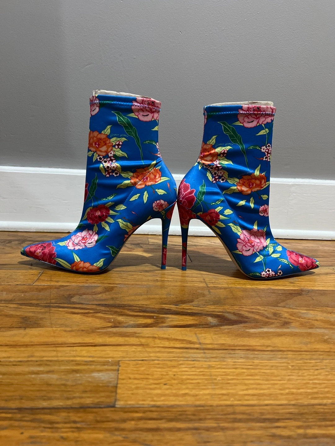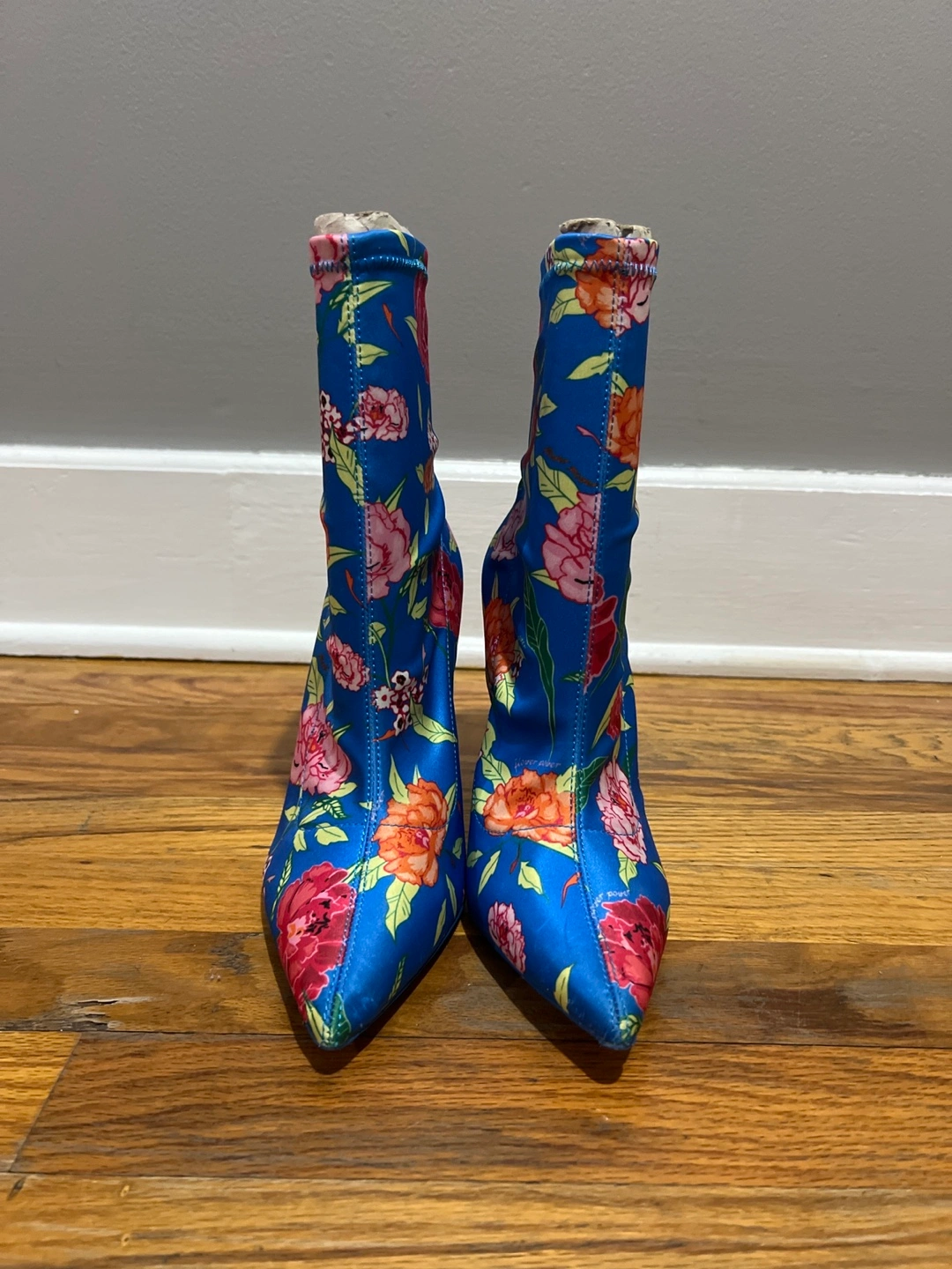 Beautiful floral print sock boots. Pointed toe, stiletto heel. Blue base with pink, orange, and green floral design. Size not shown.