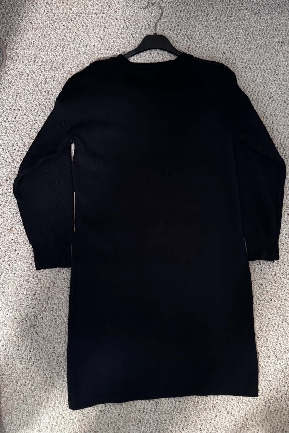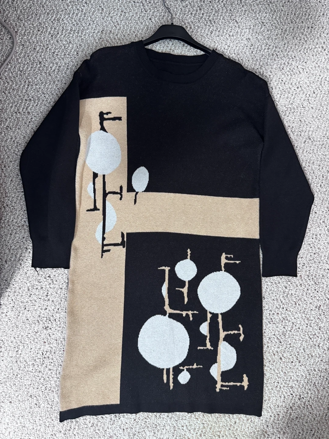 A stylish black knit dress with a unique beige and white geometric pattern. Long sleeves and crew neck. It's made from a comfortable fabric blend. This dress is a great option for a casual outing in winter with boots