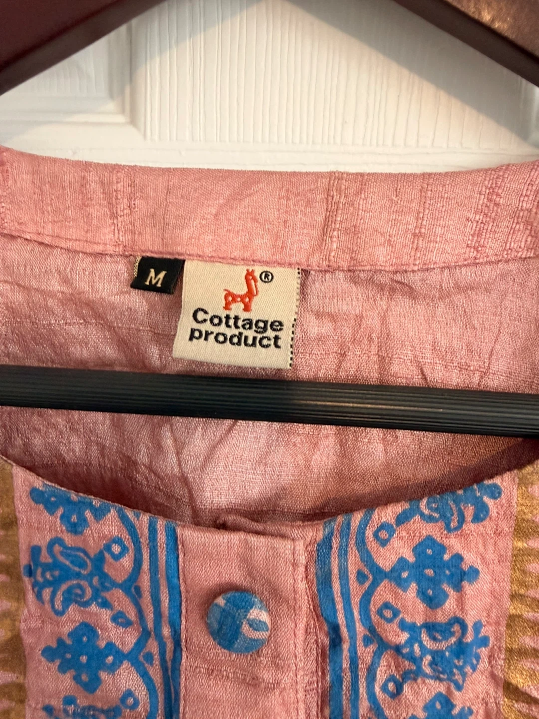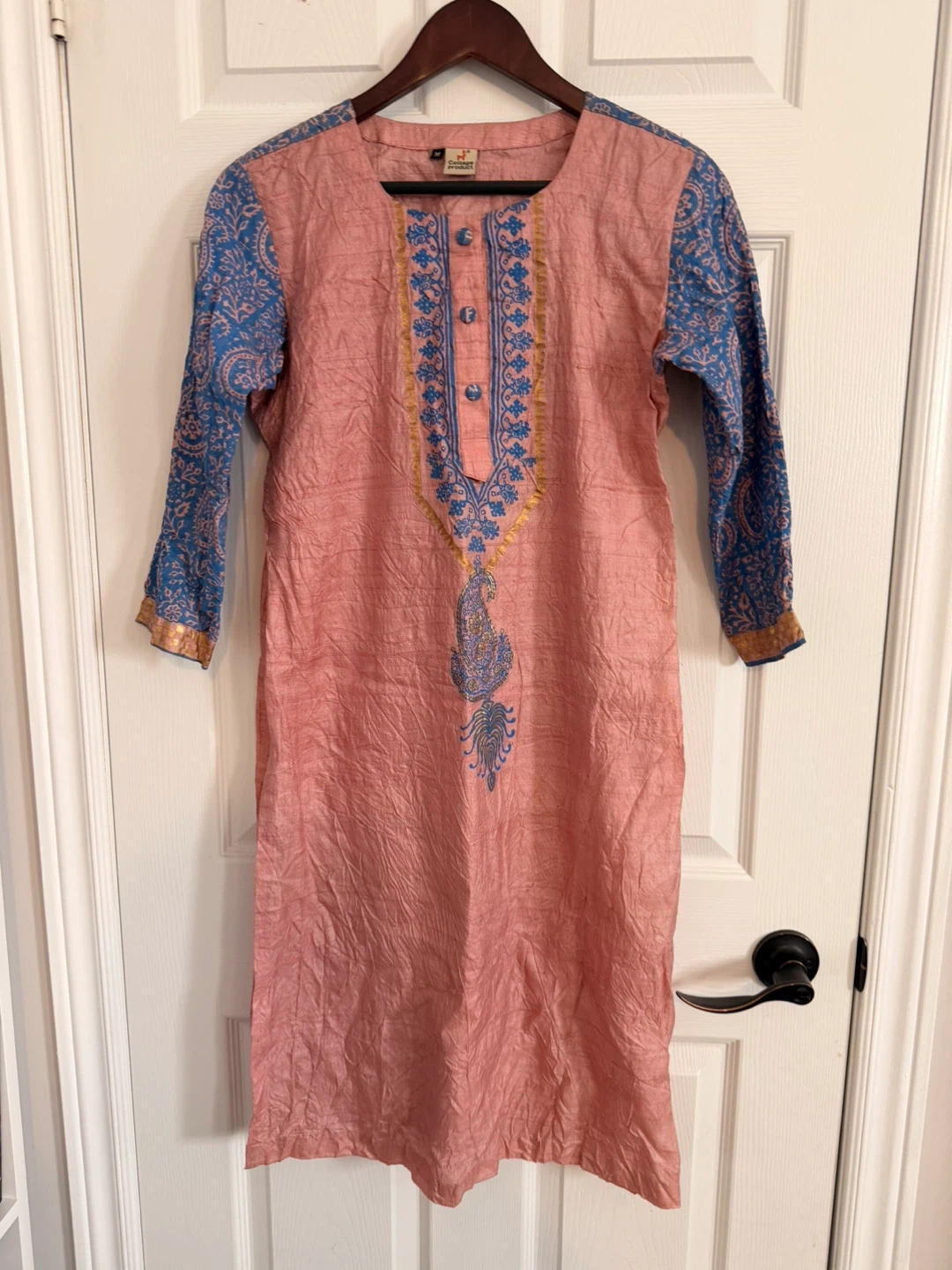 Pretty pink kurti tunic with blue paisley print sleeves, intricate details and looks gorgeous on. I got compliments from everyone to 2-3 times I’ve worn it. It's made of 100% silk. Size is medium.