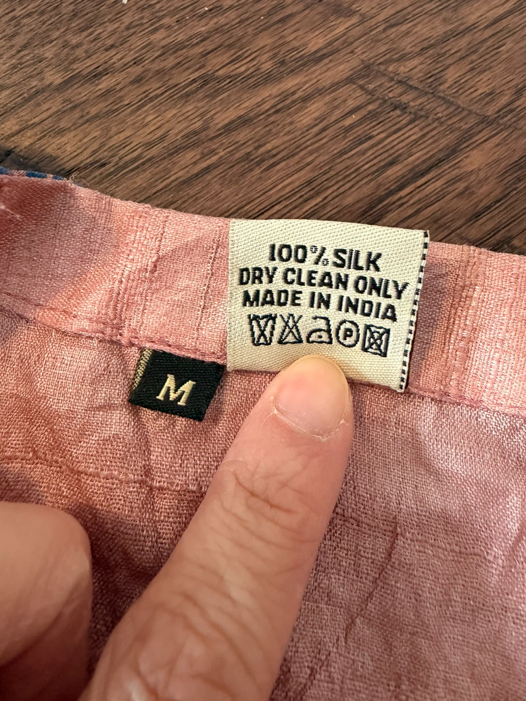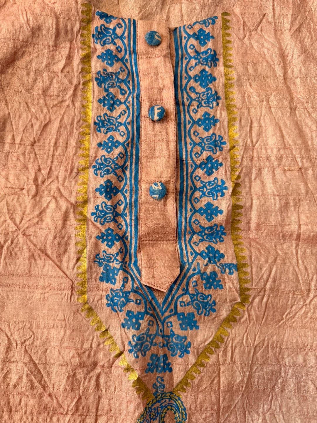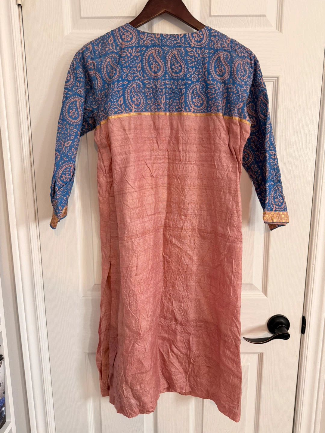 Pretty pink kurti tunic with blue paisley print sleeves, intricate details and looks gorgeous on. I got compliments from everyone to 2-3 times I’ve worn it. It's made of 100% silk. Size is medium.