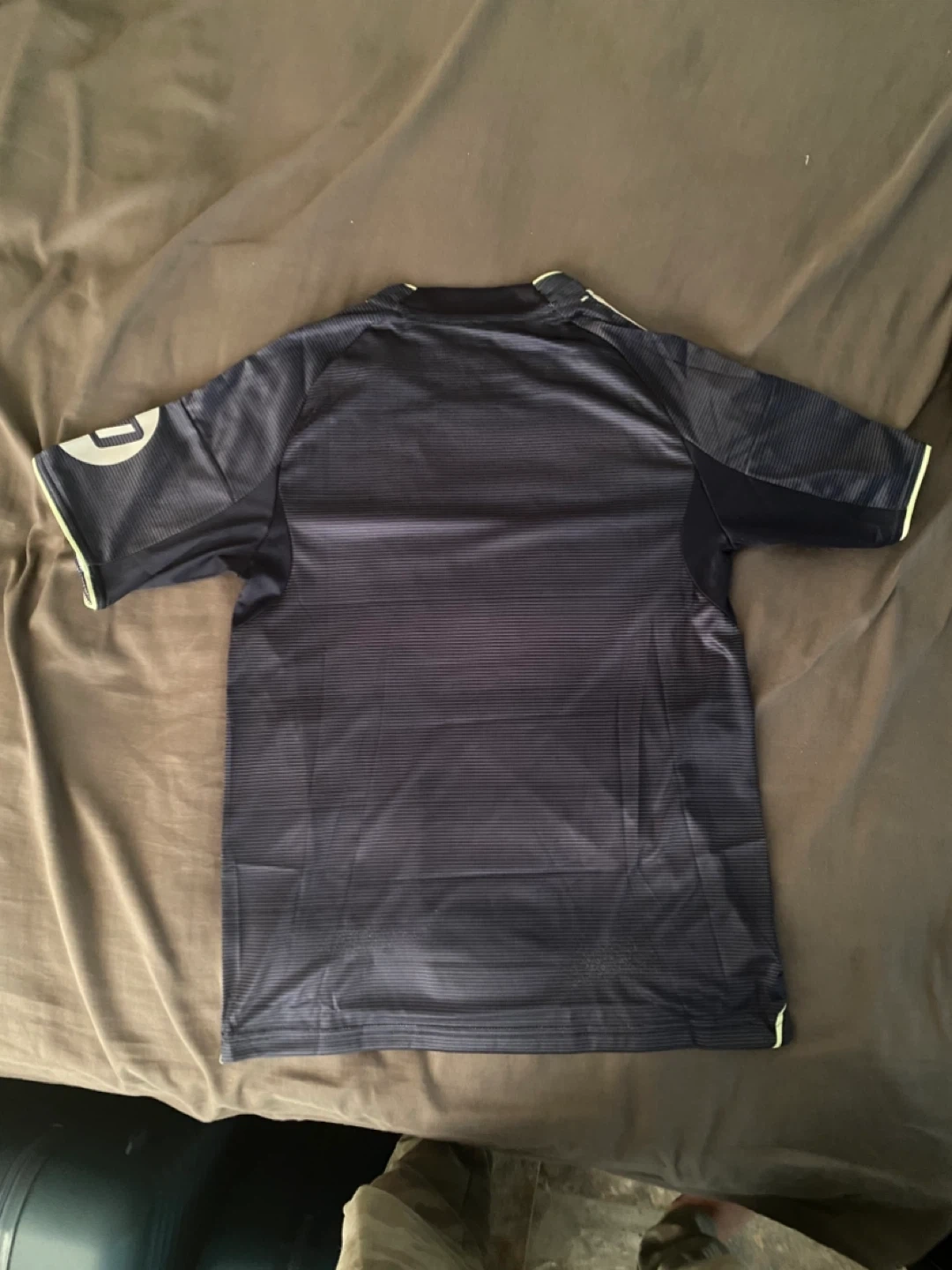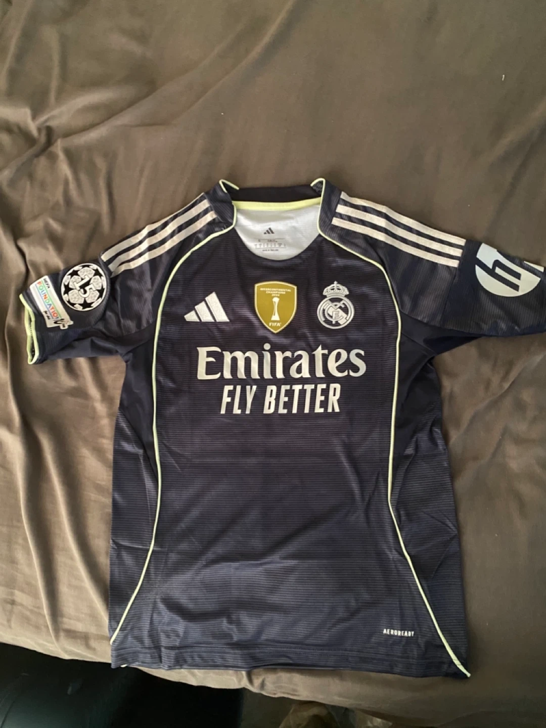 This is a Real Madrid 22/23 away jersey by Adidas. It's made with Aeroready fabric for breathability. Features the Emirates Fly Better sponsor and FIFA World Champions patch. Officially licensed by the club and league.