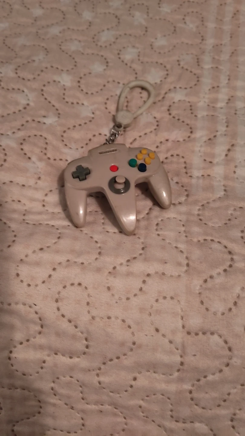 This is a Nintendo 64 controller keychain. It's a miniature replica of the iconic N64 controller, perfect for any retro gaming fan. The keychain is made of plastic and comes with a silver ring and loop attachment.