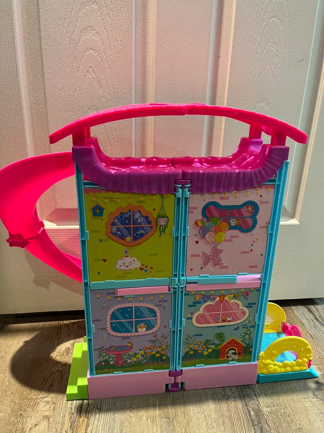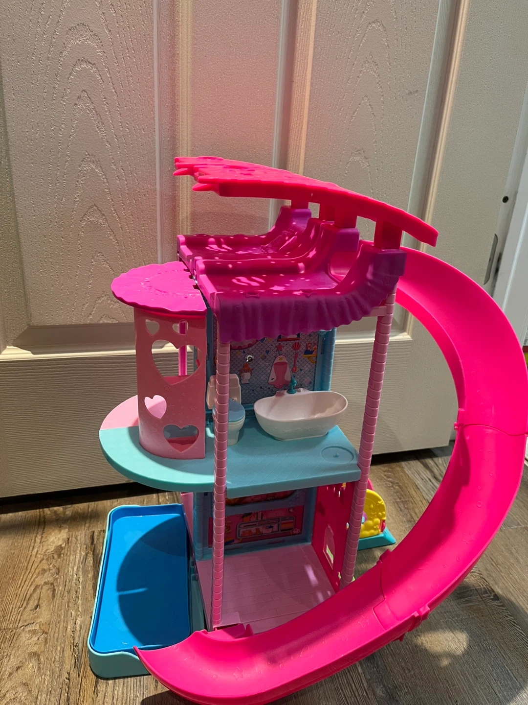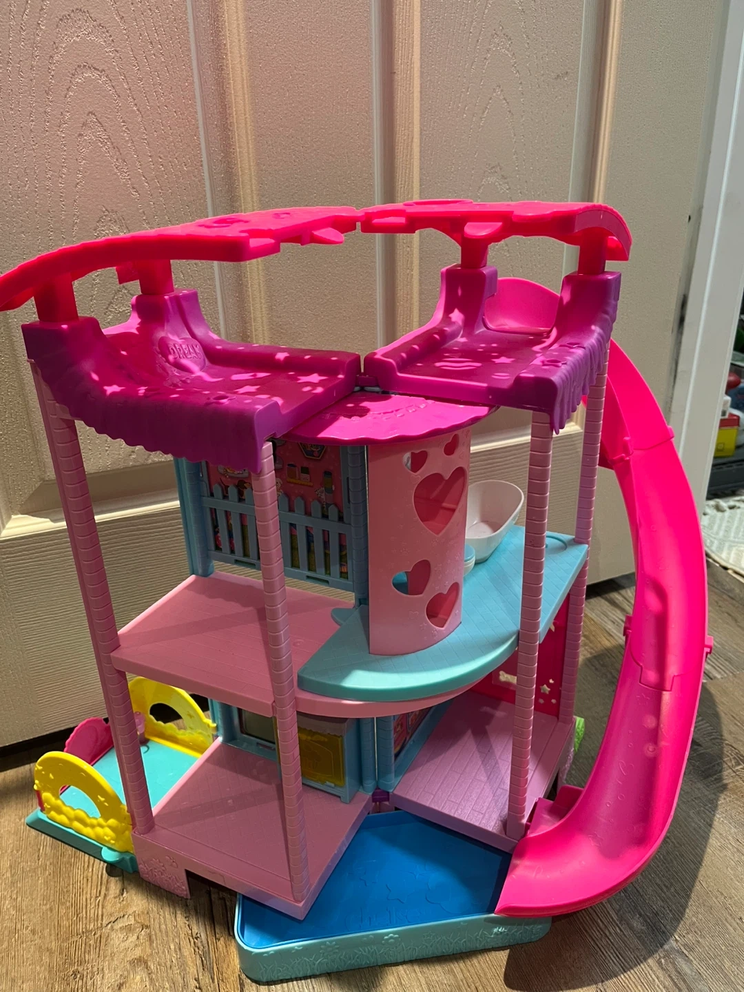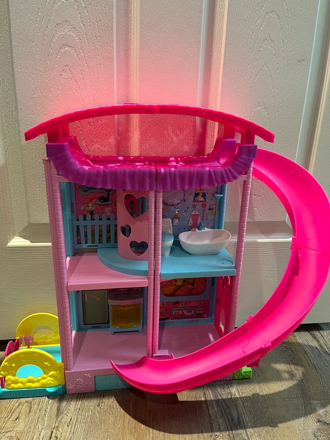 This is a colourful Barbie dollhouse with multiple levels and a fun slide. It features detailed decor on the walls, including windows and cloud designs. This is specifically for the Chelsea sized Barbie dolls.