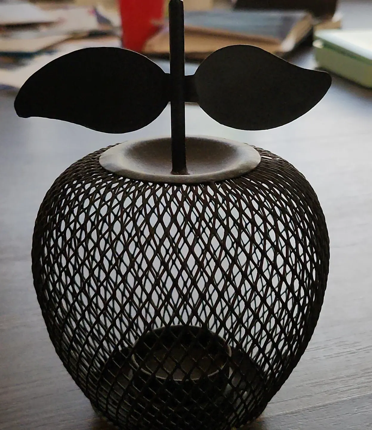 This is a decorative candle holder shaped like an apple, made from dark wire mesh.