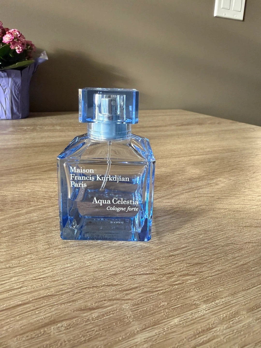 Maison Francis Kurkdjian Aqua Celestia Cologne Forte. It's a fragrance with a fresh scent. Bottle is clear blue glass with a blue cap. 40% left